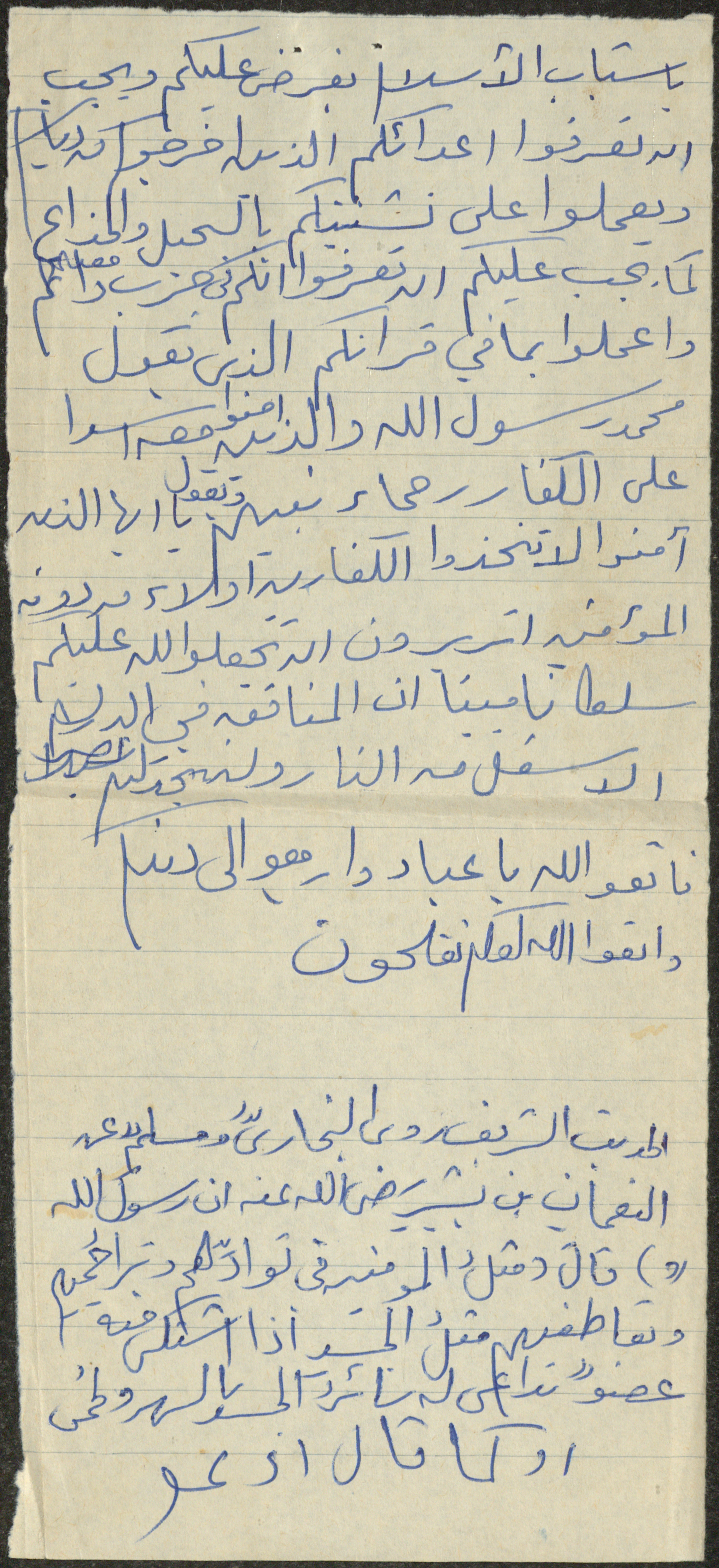 نص خطبة صلاة جمعة للشيخ سعادة حسن ذيب المراشدة، إمام وخطيب مسجد في قرية عقربا ما بين عامي 1962 و2002، أكد فيها للمسلمين على ضرورة عدم اتباع الكفار أولياء.