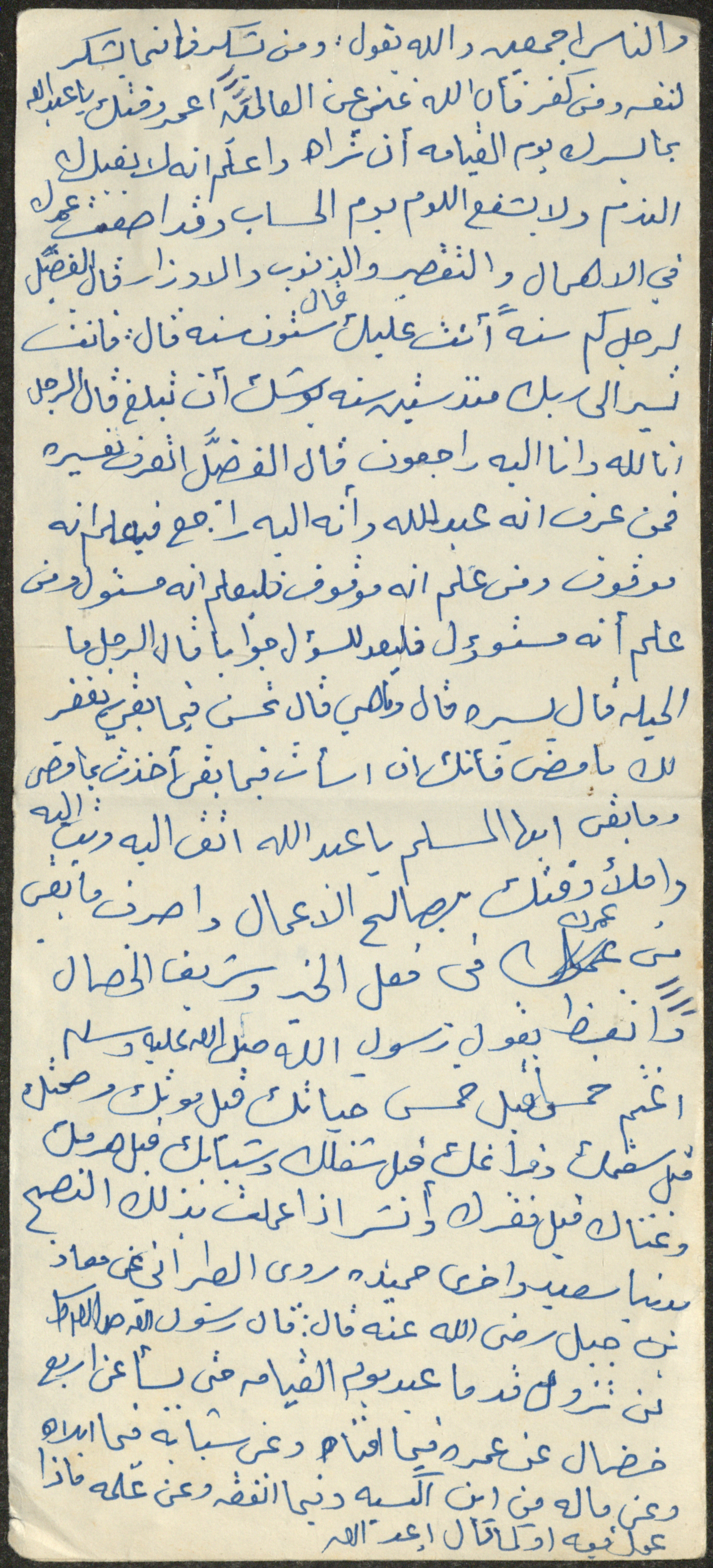 نص خطبة صلاة جمعة للشيخ سعادة حسن ذيب المراشدة، إمام وخطيب مسجد في قرية عقربا ما بين عامي 1962 و2002، تحدث فيها عن الحساب يوم القيامة.