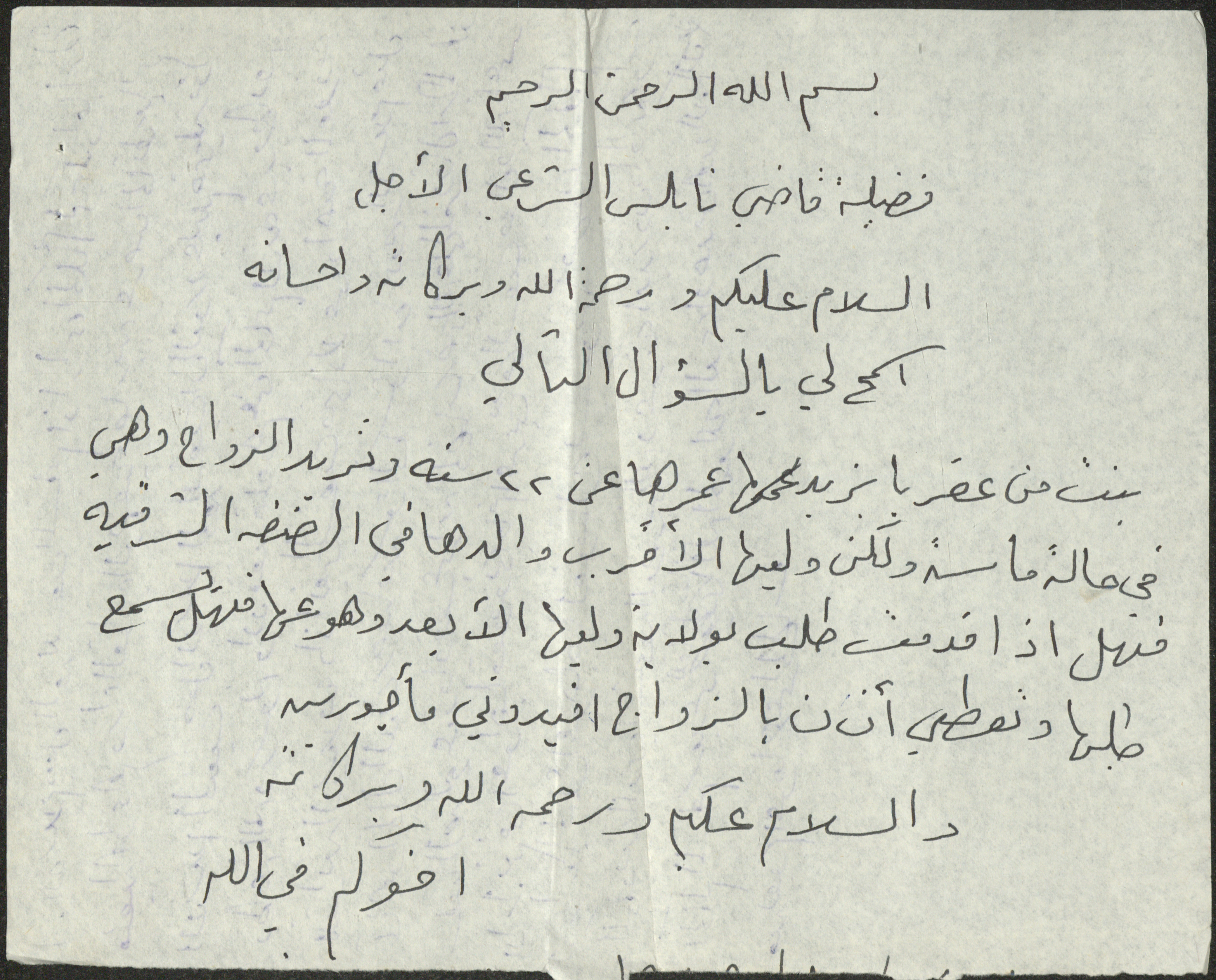 رسالة موجهة إلى قاضي نابلس الشرعي، يستفسر فيها المرسل عن إمكانية تزويج فتاة بإذن من وليها الأبعد، حيث أن وليها الأقرب وهو والدها يعيش في الأردن، أما هي فتعيش في قرية عقربا قضاء نابلس.