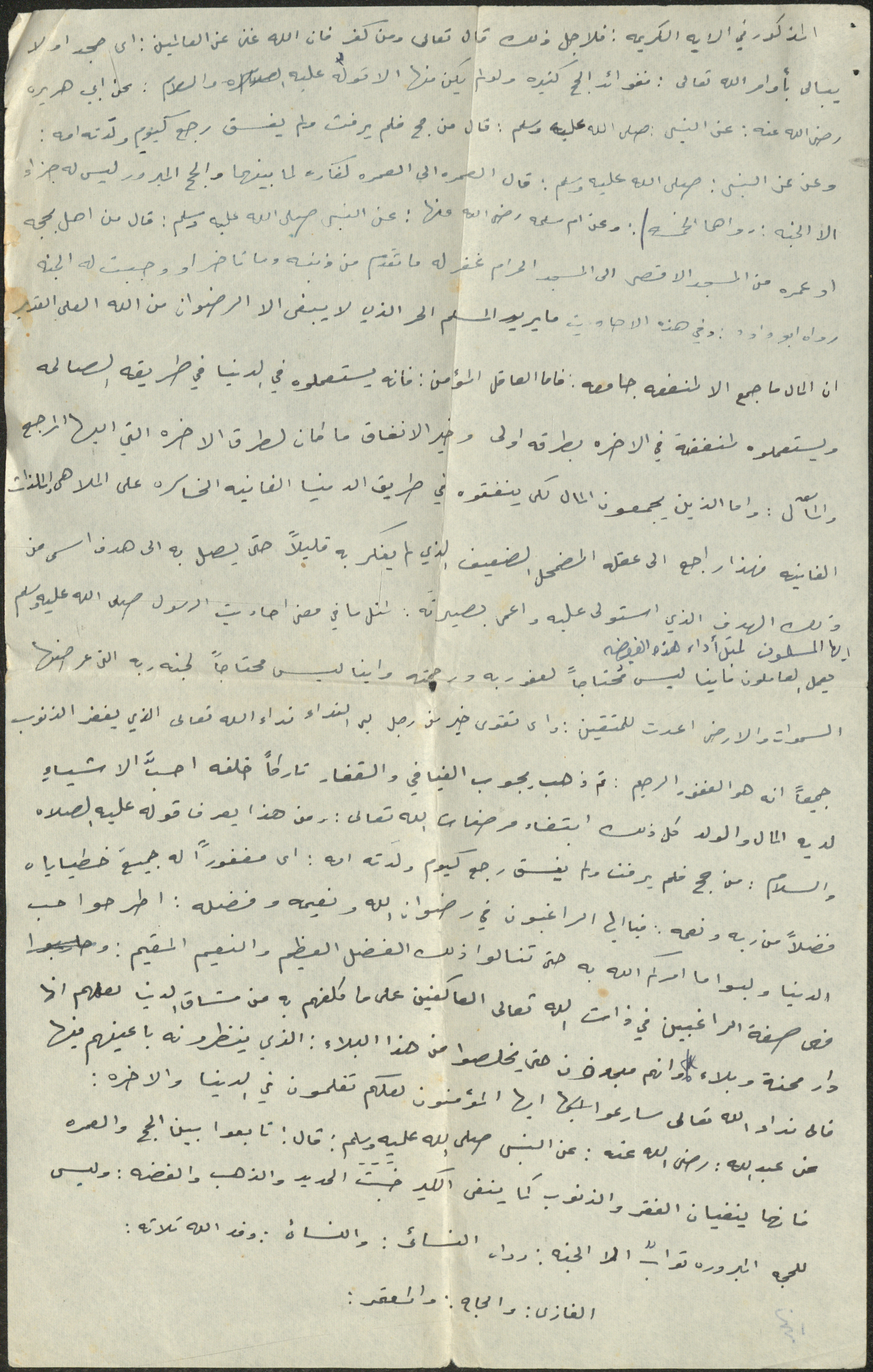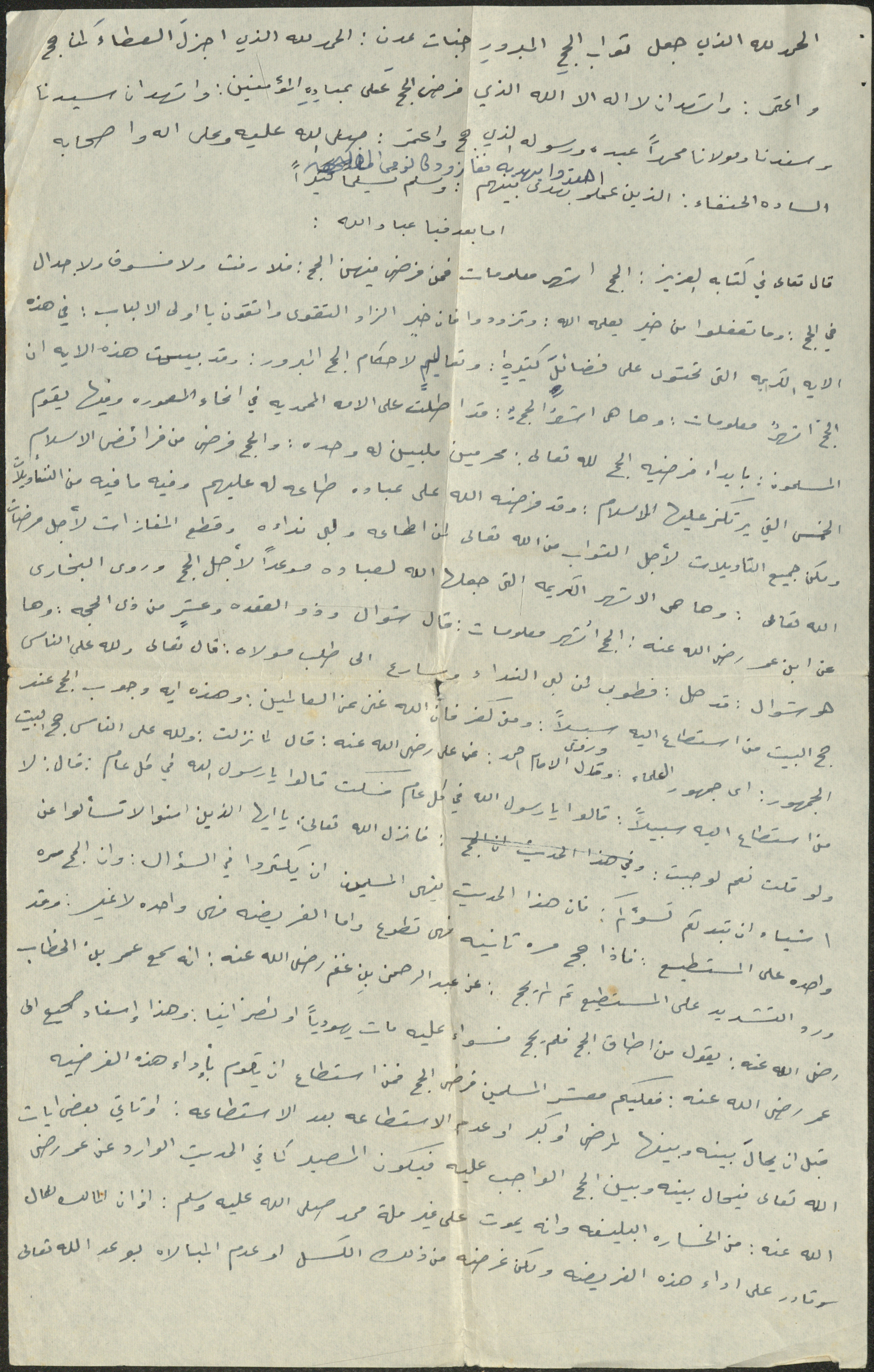 نص خطبة صلاة جمعة للشيخ سعادة حسن ذيب المراشدة، إمام وخطيب مسجد في قرية عقربا ما بين عامي 1962 و2002، تحدث فيها عن فريضة الحج.