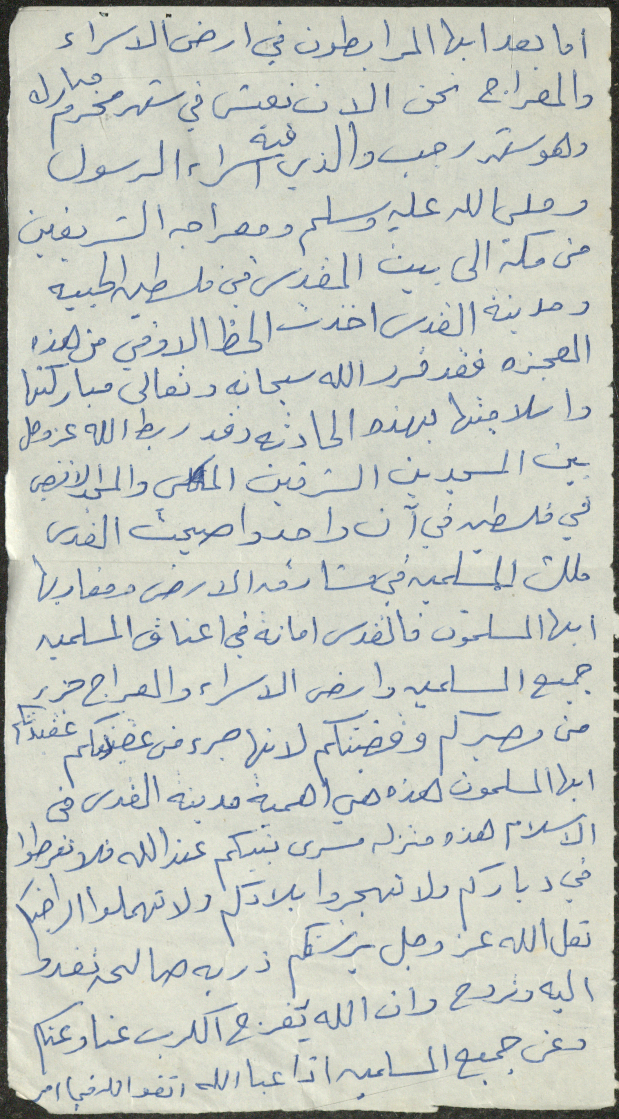 نص خطبة صلاة جمعة للشيخ سعادة حسن ذيب المراشدة، إمام وخطيب مسجد في قرية عقربا ما بين عامي 1962 و2002، تحدث فيها عن الرباط في أرض الإسراء والمعراج.