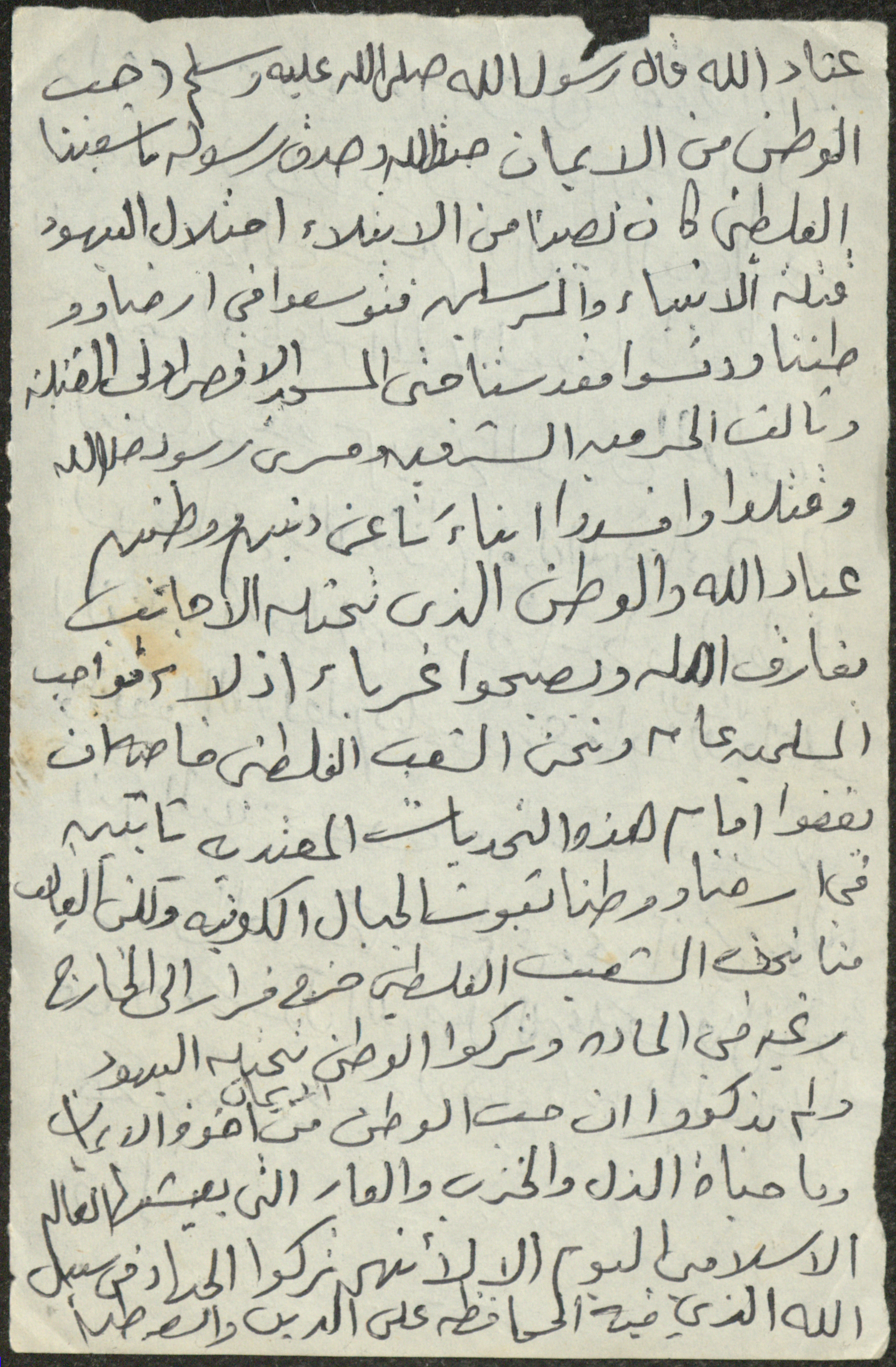 This document shows the text of a Friday Khutba by Sheikh Sa'adeh Hasan Theeb al-Marashdeh, the imam and khatib at Aqraba Mosque from 1962 to 2002, in which he talked about the suffering of the Palestinian people.