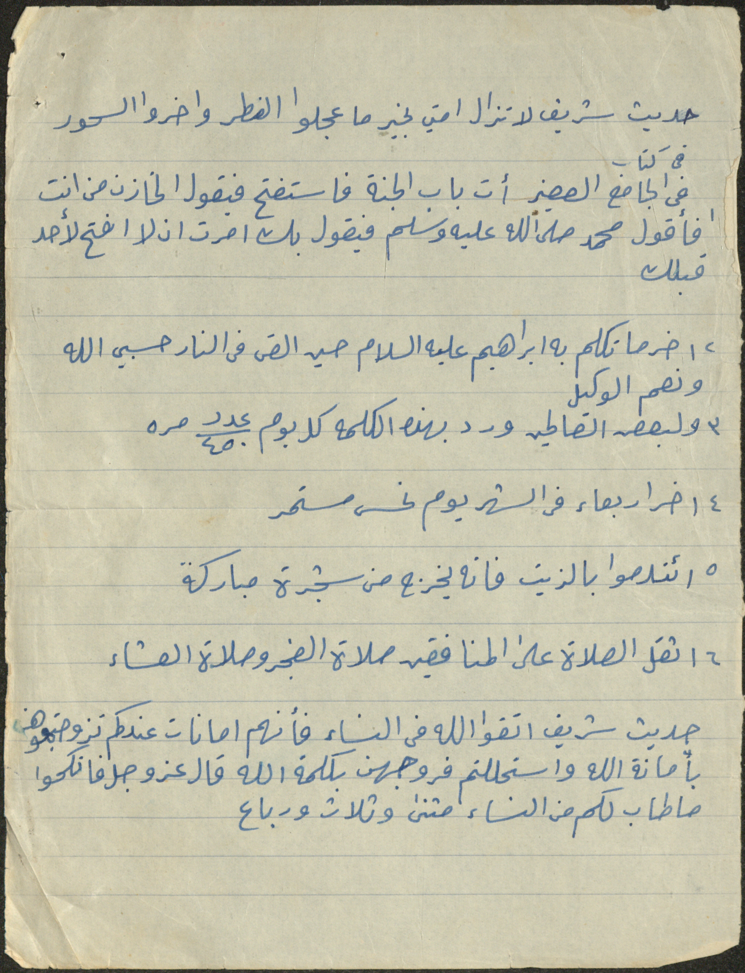 قصاصة ورقية، وجدت ضمن مجموعة حمزة عقرباوي، تحتوي مجموعة من الأحاديث النبوية.
