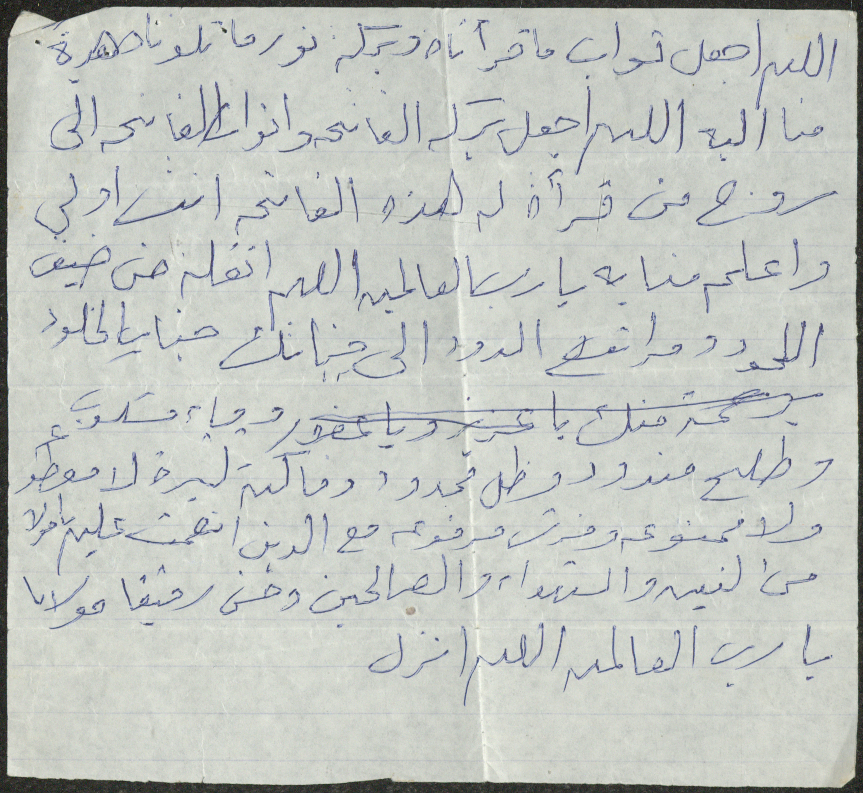 قصاصة ورقية، وجدت ضمن مجموعة حمزة عقرباوي، كُتب عليها نص أحد الأدعية الدينية.