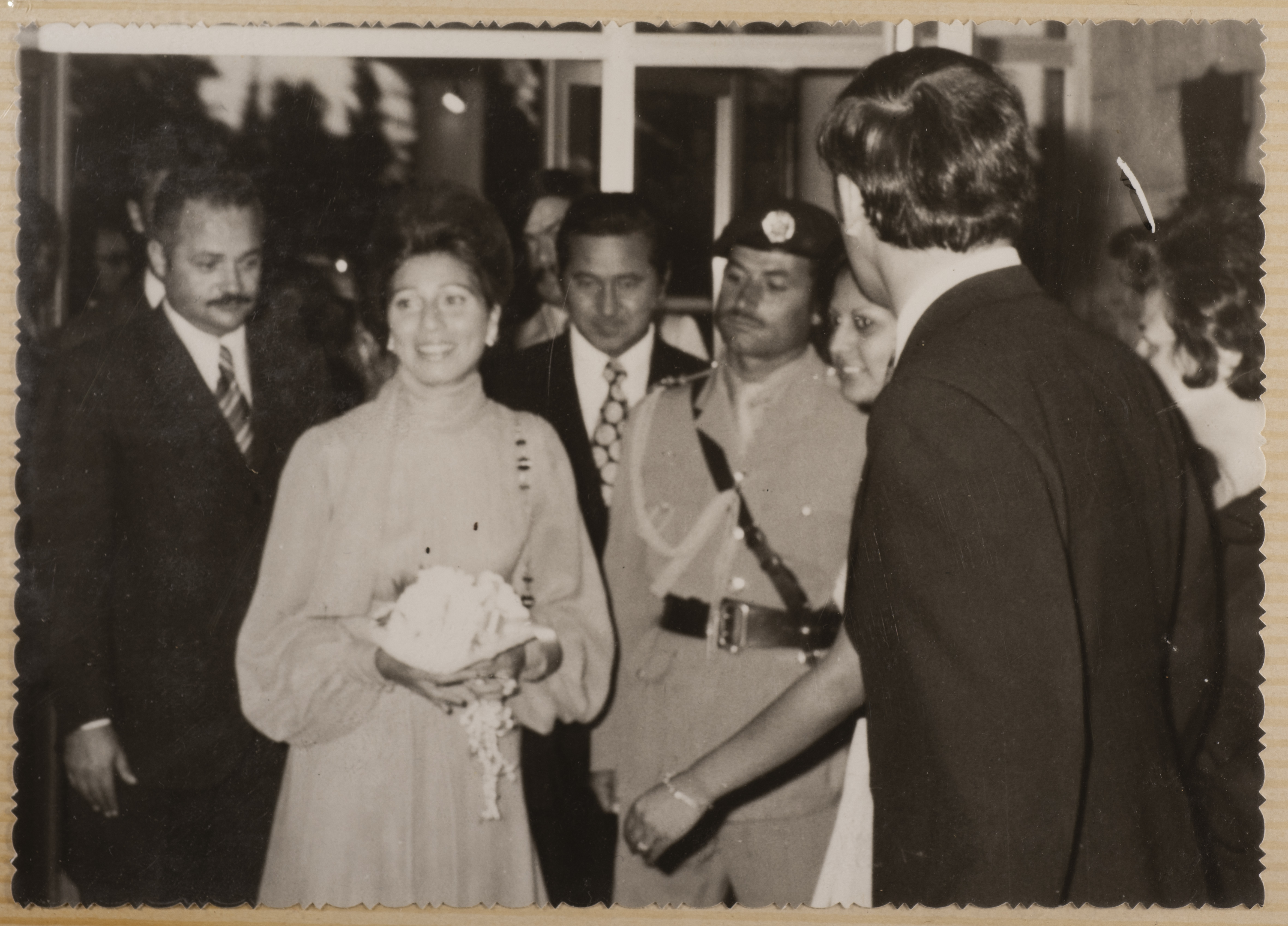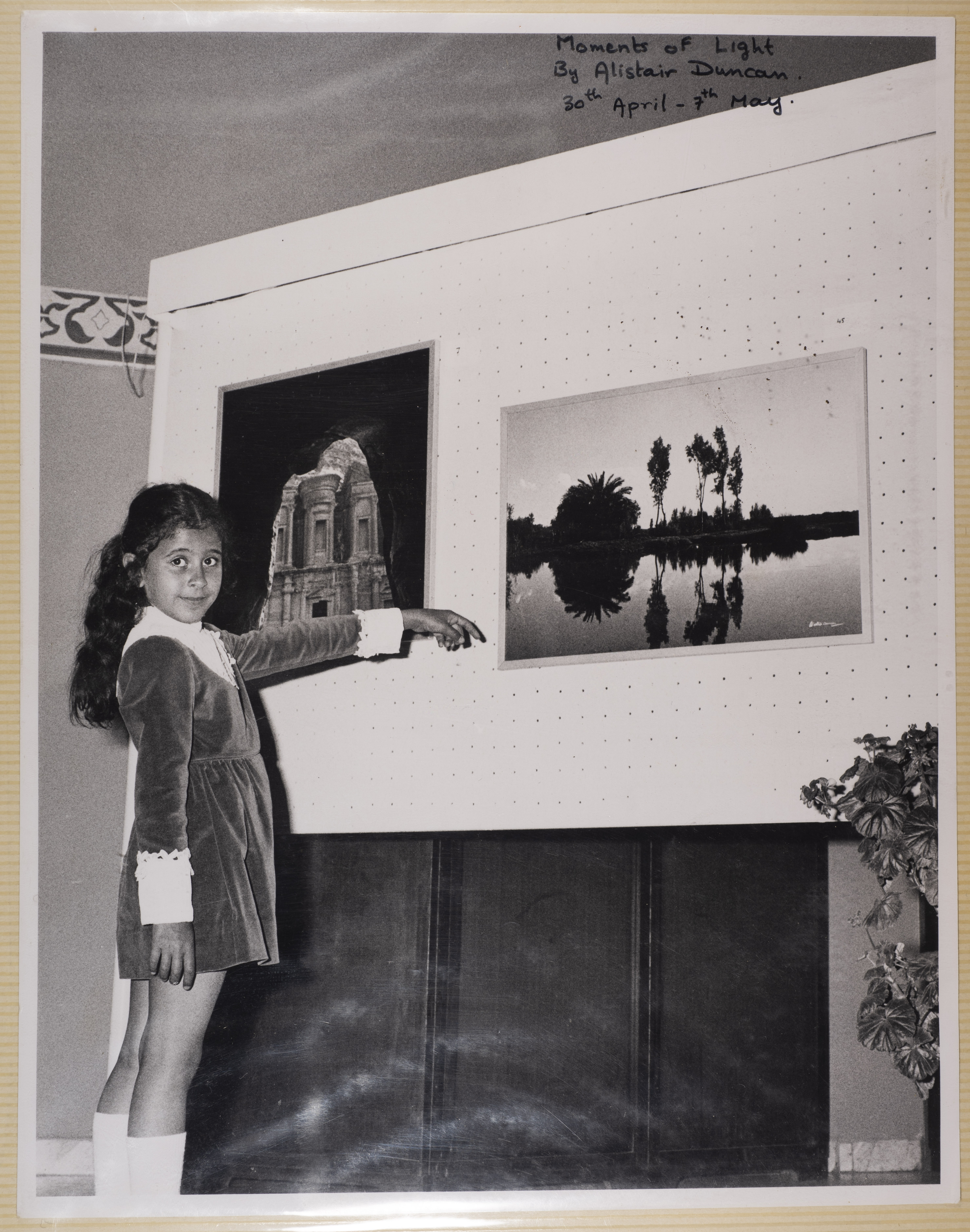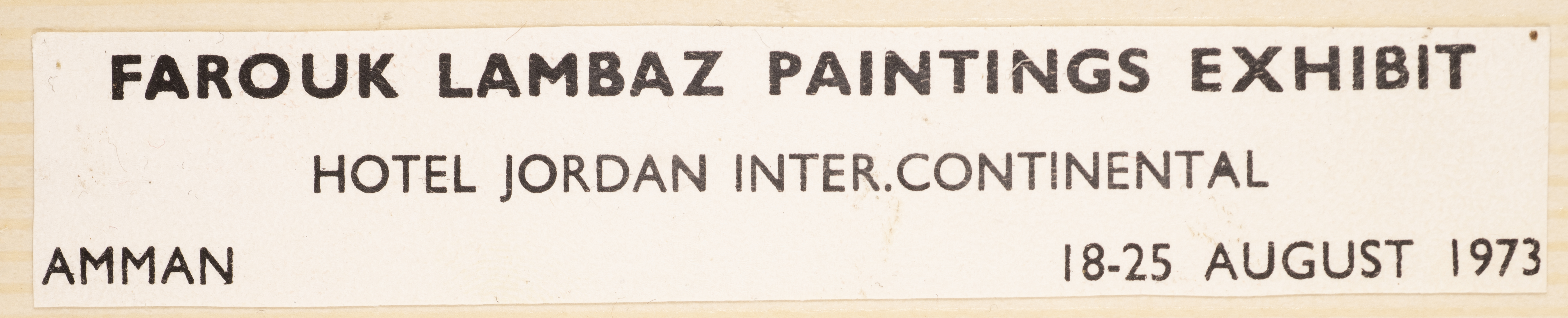 This photograph, from the exhibition of artist Farouk Lambaz, was taken during his participation in a show held at Nuha Batshoun’s gallery, The Gallery, at the Intercontinental Hotel in Amman from August 18 to 25, 1972. The exhibition was inaugurated under the patronage of Queen Alia.