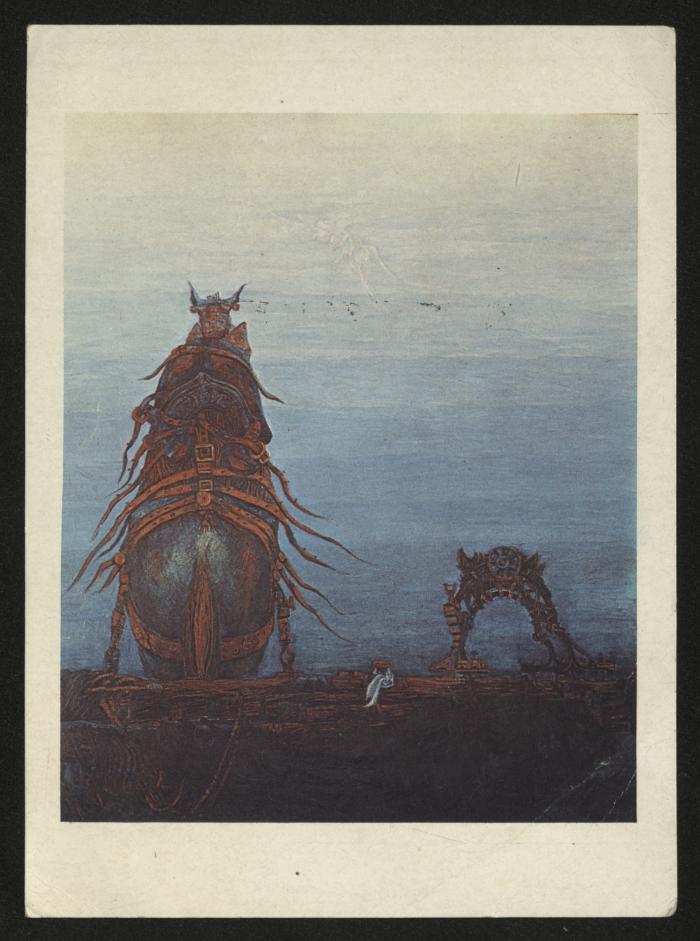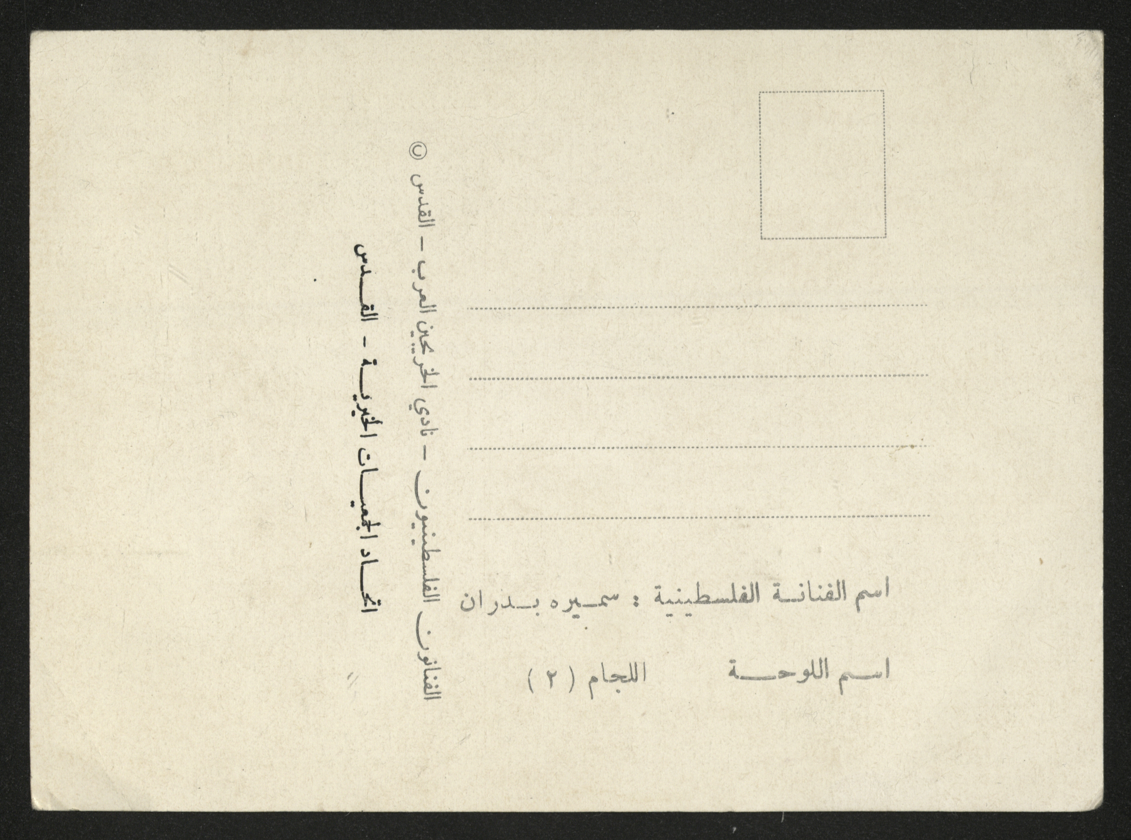 A postcard featuring the painting "Bridle no. 2" by artist Samira Badran, it is the part of the "Palestinian Artists" series, issued by the Arab Alumni Club in Jerusalem.