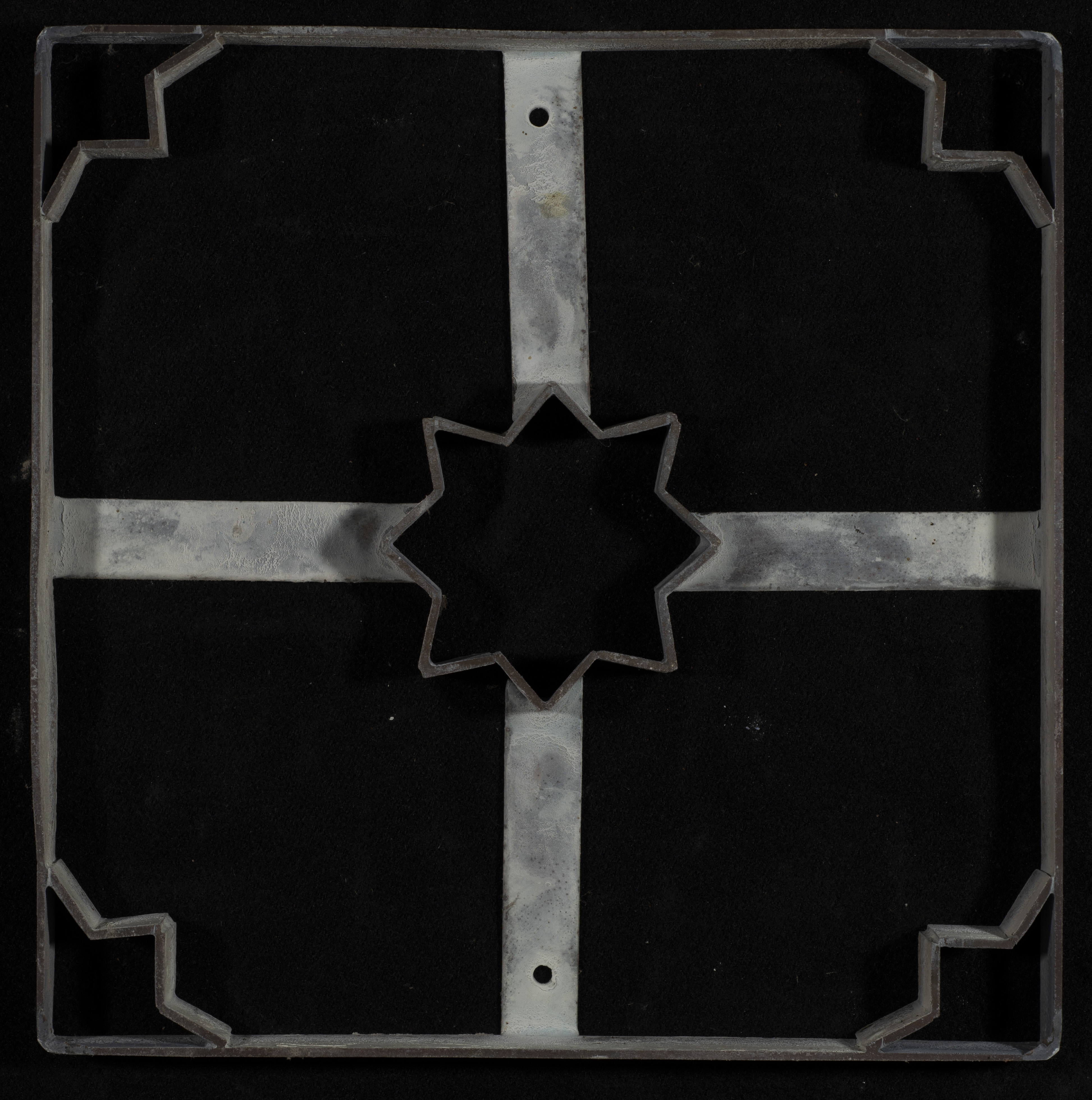 A coloured cement tile, along with the copper mold used to cast it which the Aslan family used at their factory in Nablus. The mold has been used in Ramallah and Yaffa since the 1920s to this day.