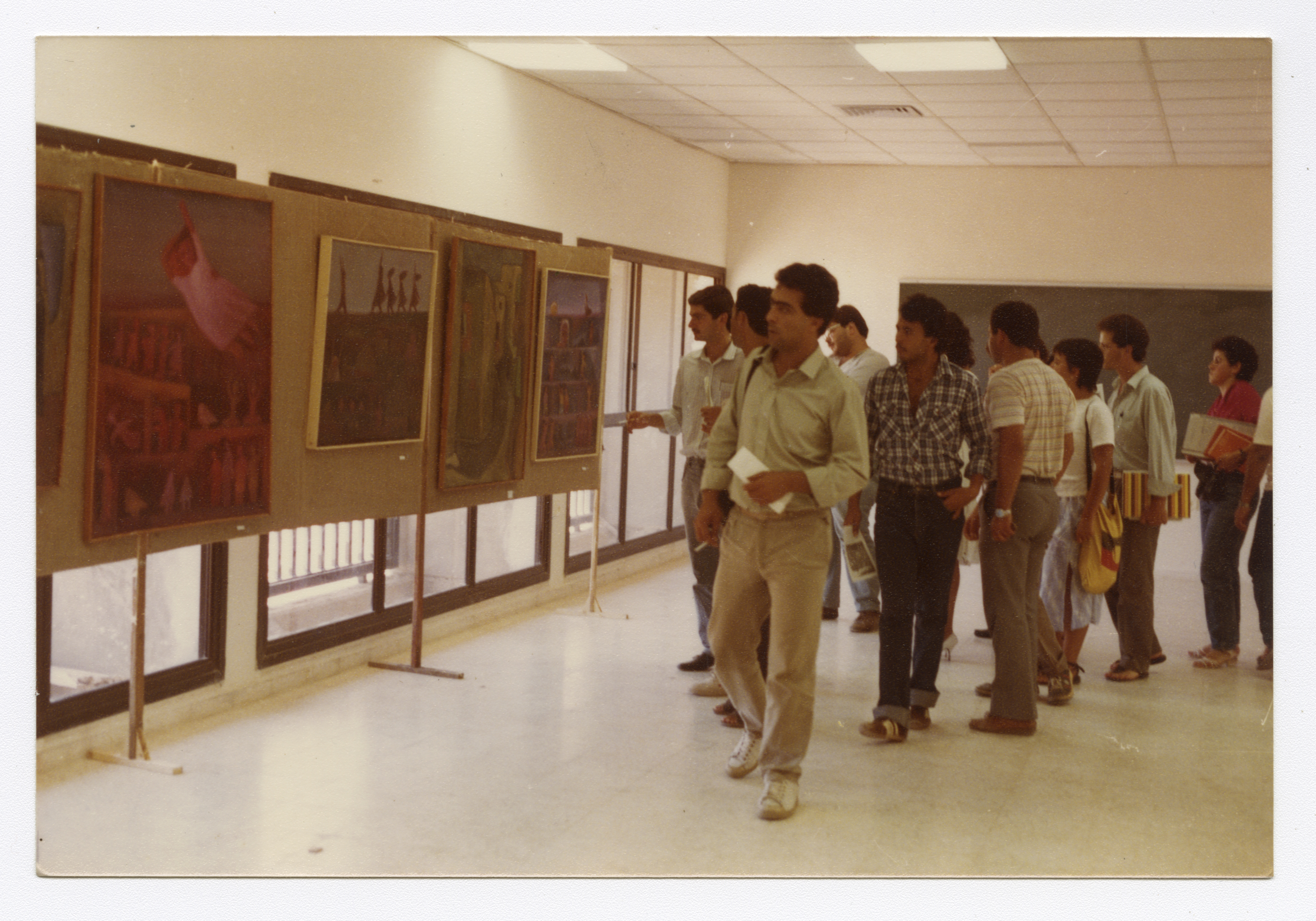 A photograph for a group of students visit the exhibition of artist Tayseer Barakat, organized by the department of student activities at Birzeit University, in the 1980s.