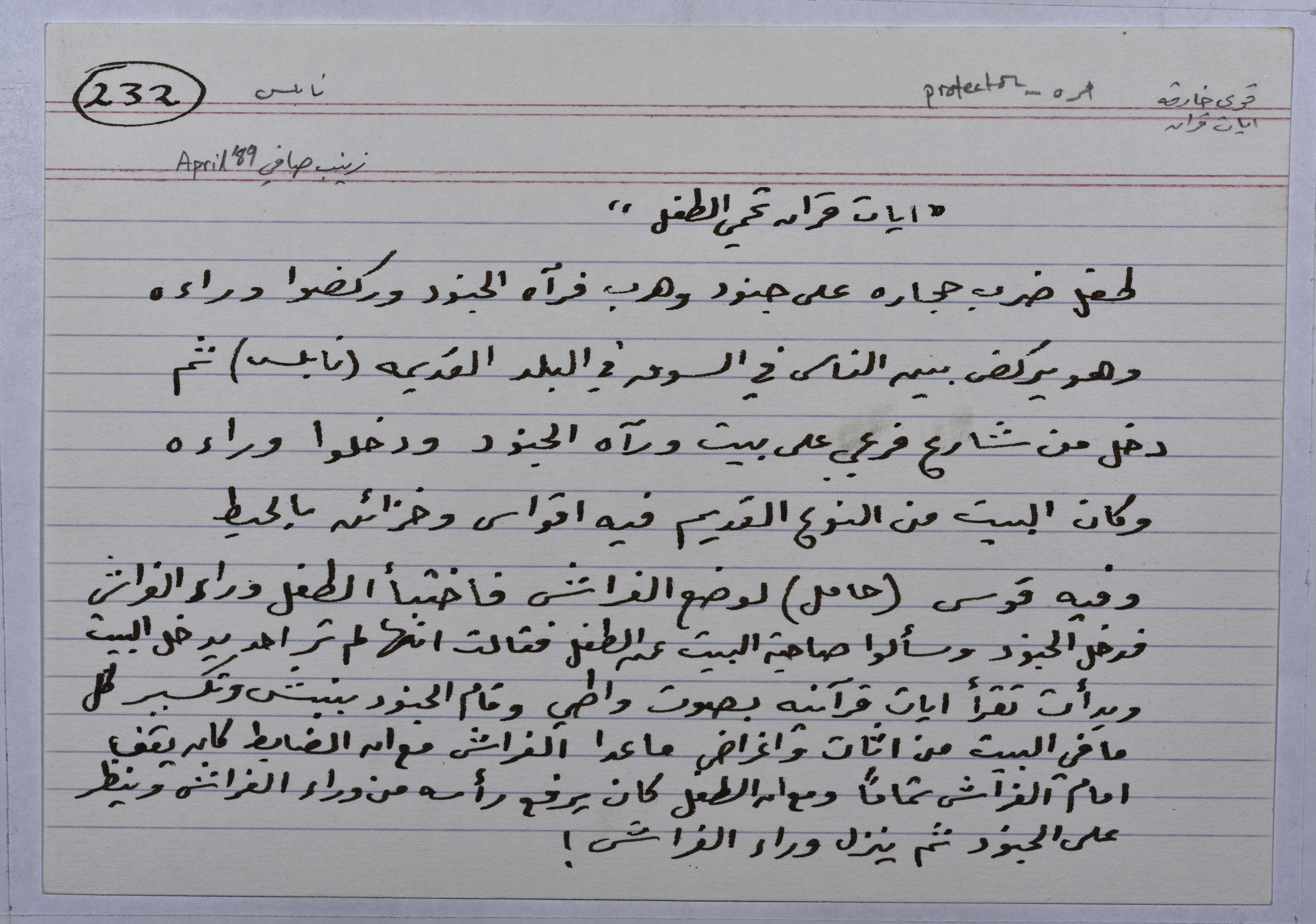A card documenting an Intifada story entitled "Qur'anic Verses That Protect the Child"