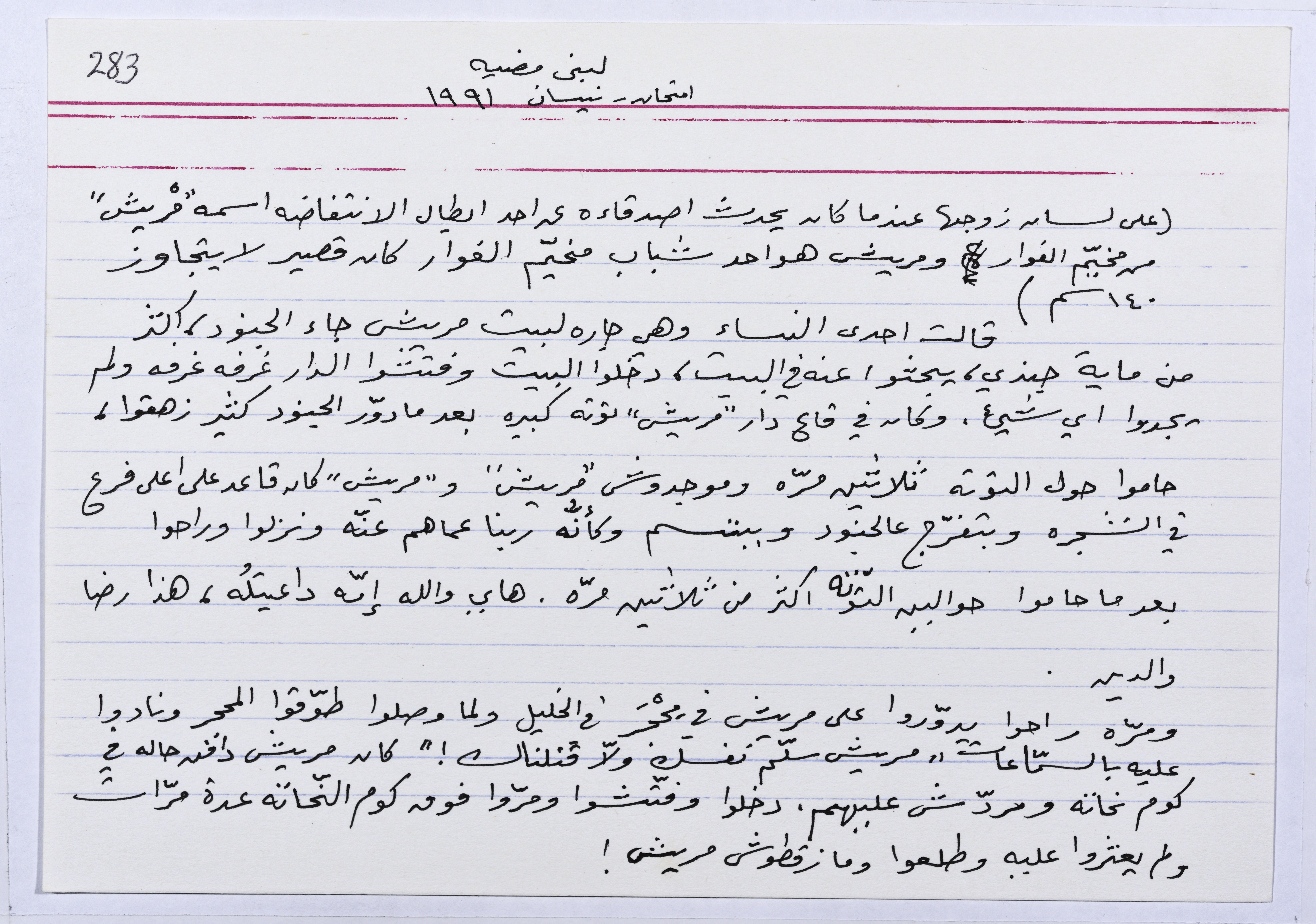 بطاقة وُثِّق عليها حكاية من الانتفاضة عن شخص يدعى مريش من مخيم الفوار كان الاحتلال يبحث عنه ولا يعثر عليه رغم وجوده في المكان