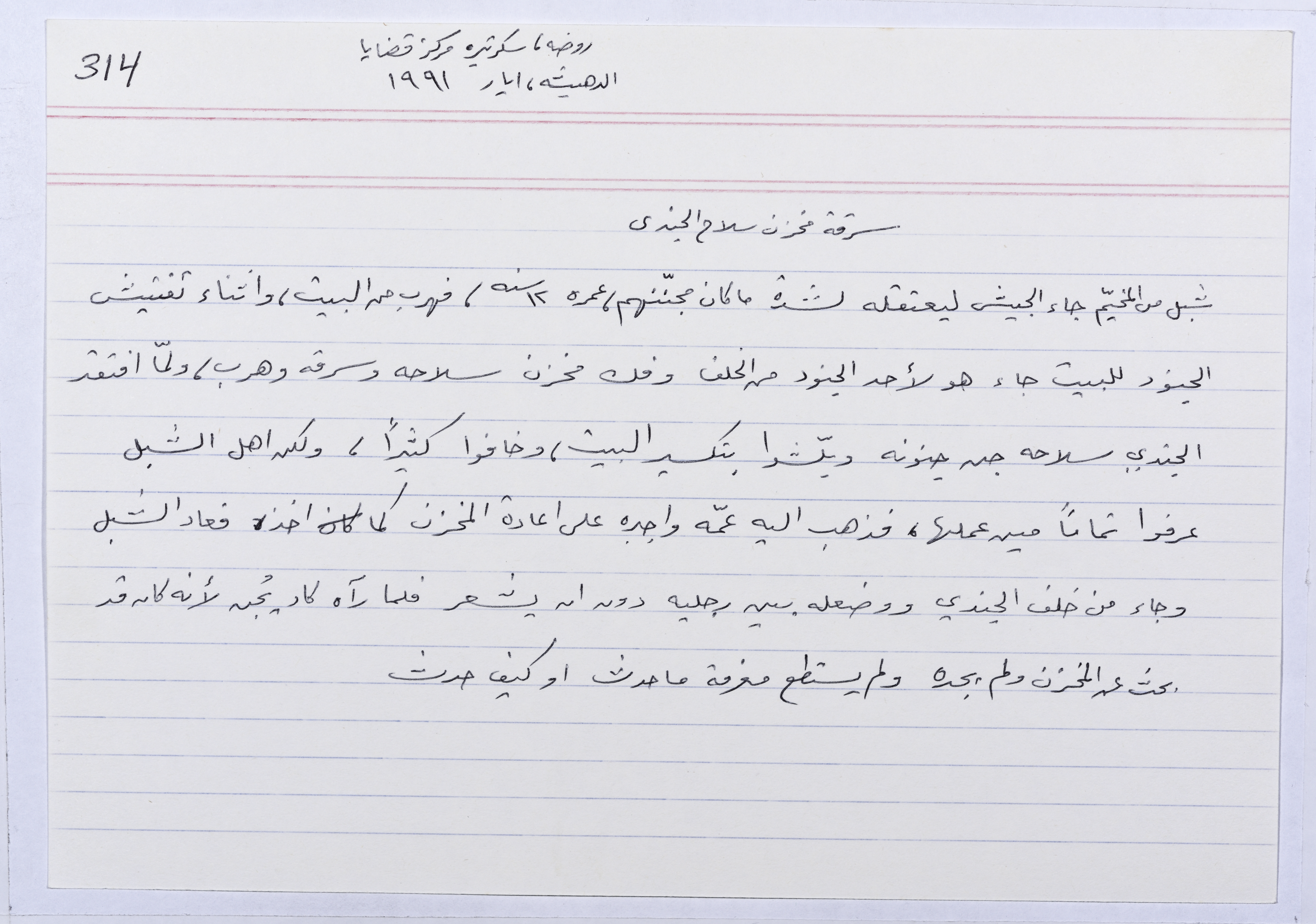 بطاقة وُثِّق عليها حكاية من الانتفاضة بعنوان سرقة مخزن سلاح الجندي