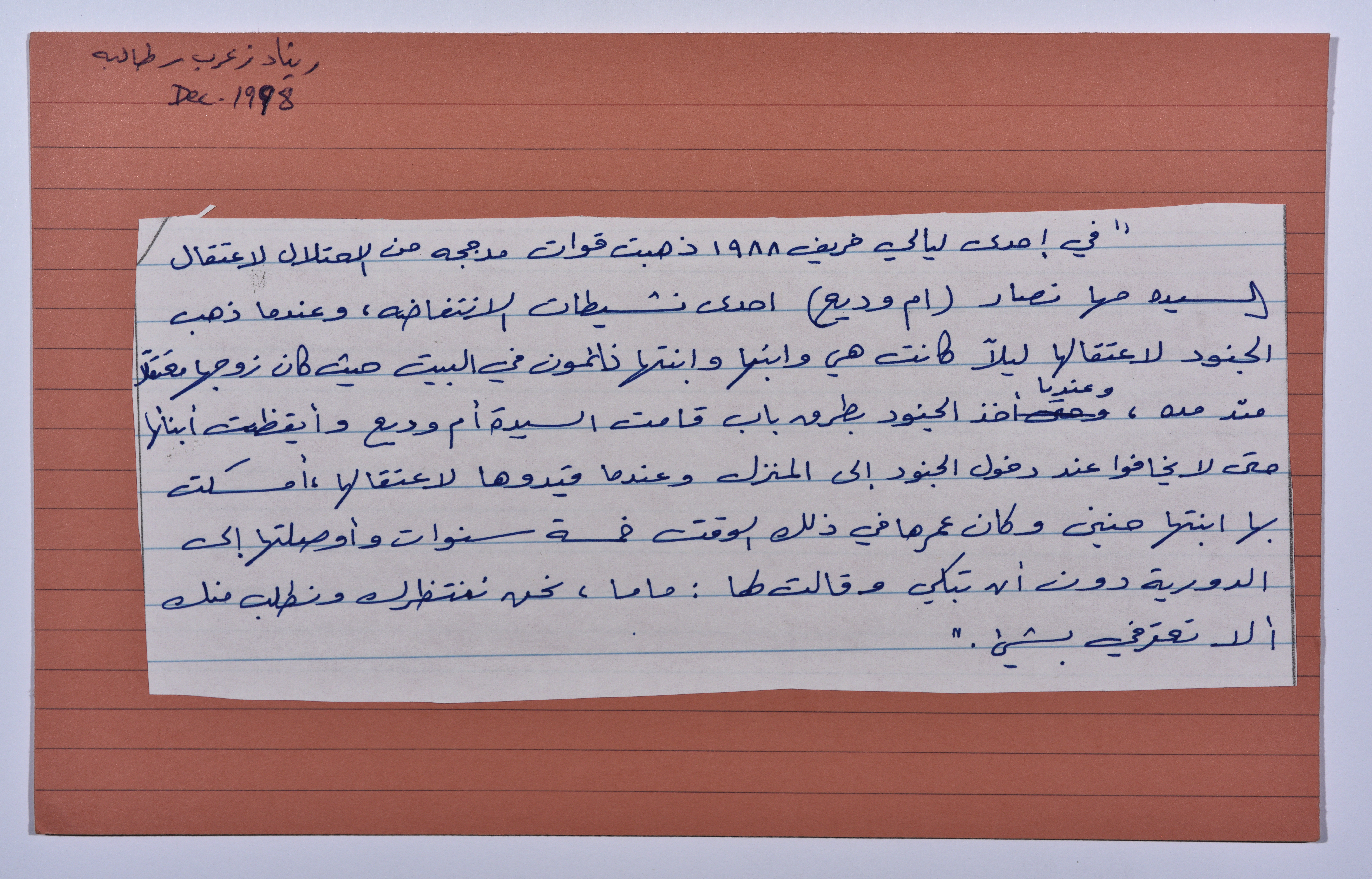 بطاقة وُثِّق عليها حكاية من الانتفاضة الفلسطينية الأولى