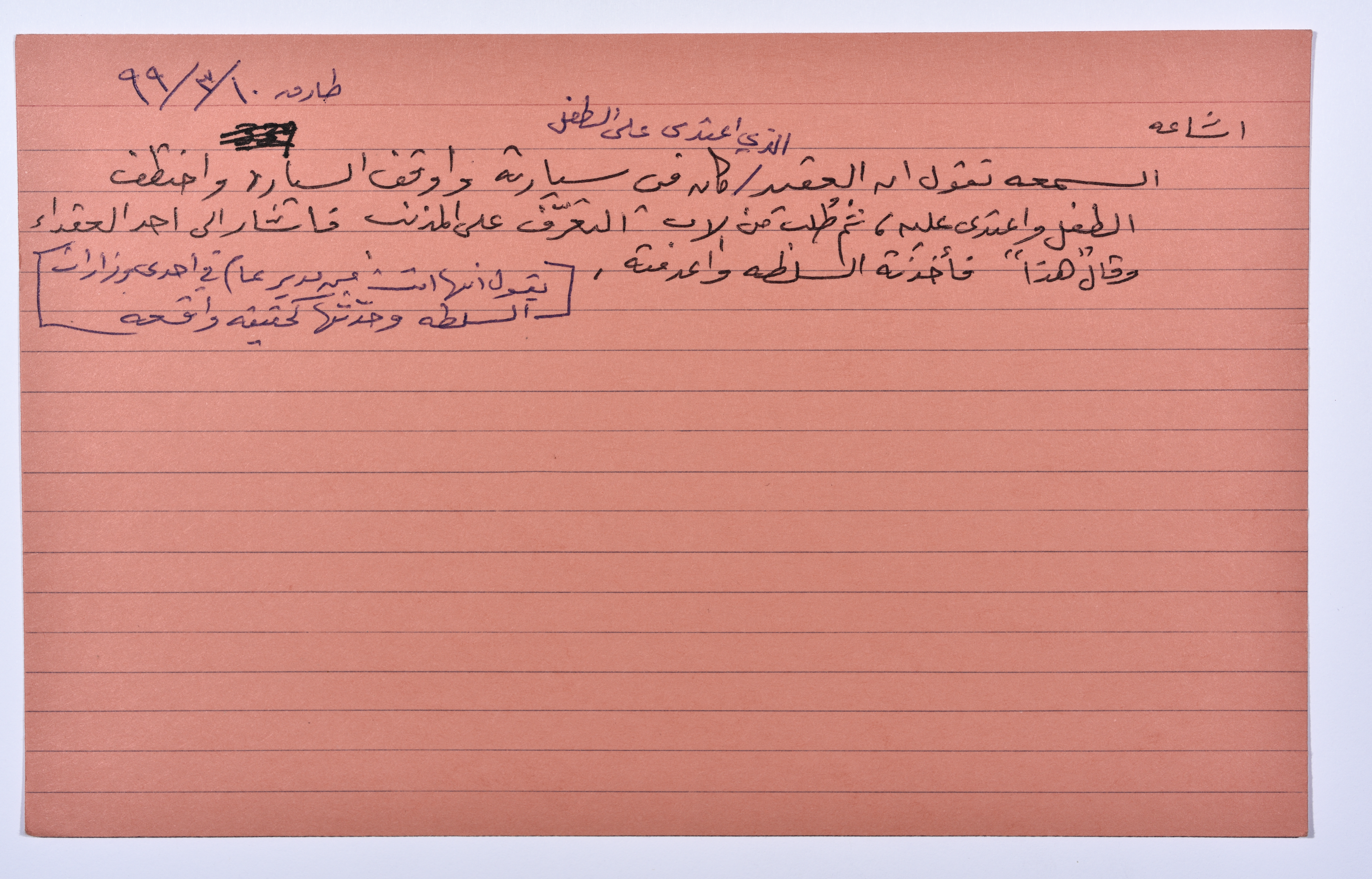 These jokes and stories were collected and recorded by Sharif Kanaana, from the late 1980s until 2005. Each card includes the name of the narrator, the place of residence and the date. This card refers to a rumour about the execution of a colonel who had raped a Gazan boy, 10 March 1999.