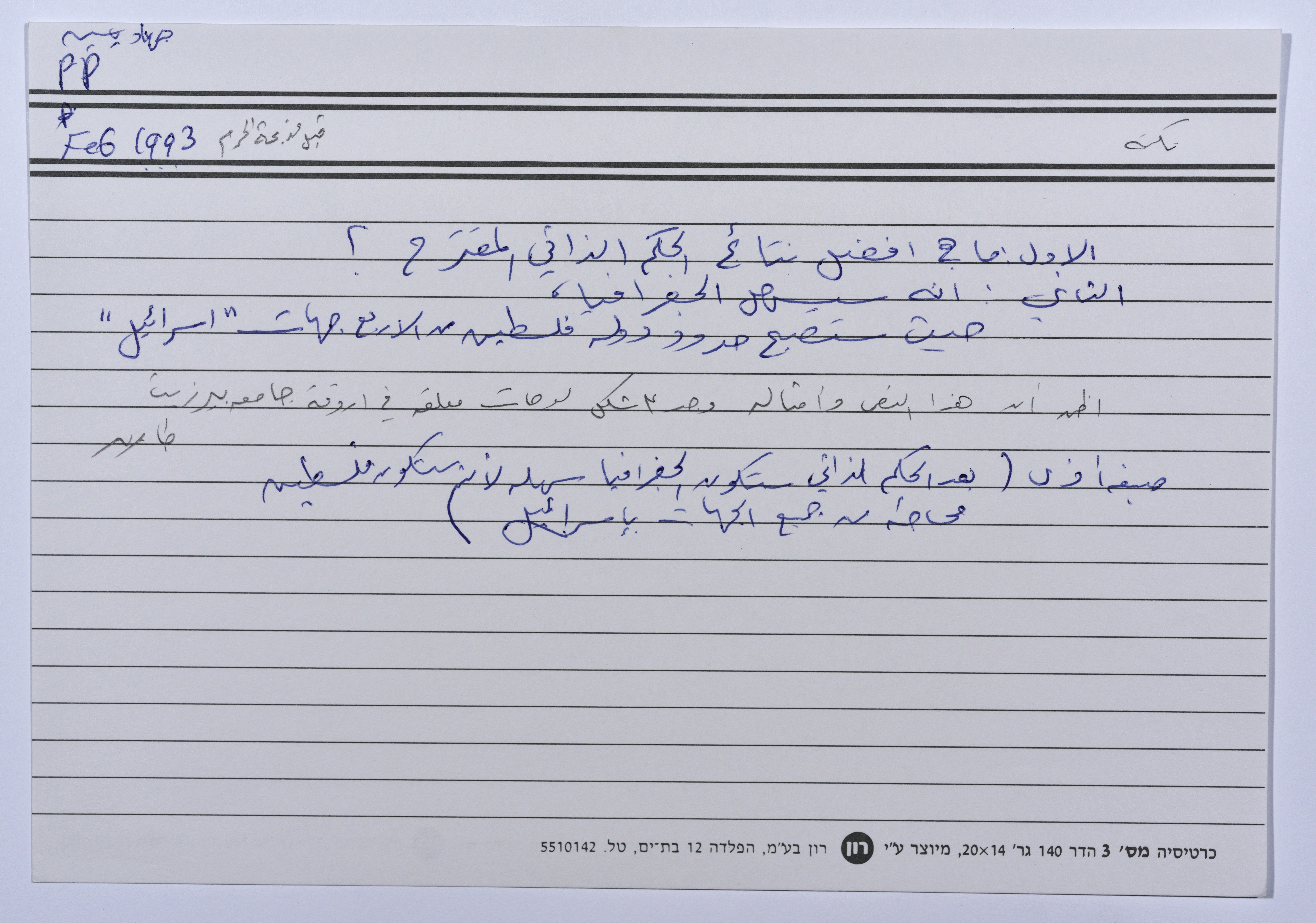جُمعت هذه النكت من قِبل شريف كناعنة، بدأ بجمعها من أواخر الثمانينيات حتى منتصف العقد الأول من القرن الواحد العشرين. تتضمن البطاقة اسم راوي النكتة ومكان سكنه والتاريخ.