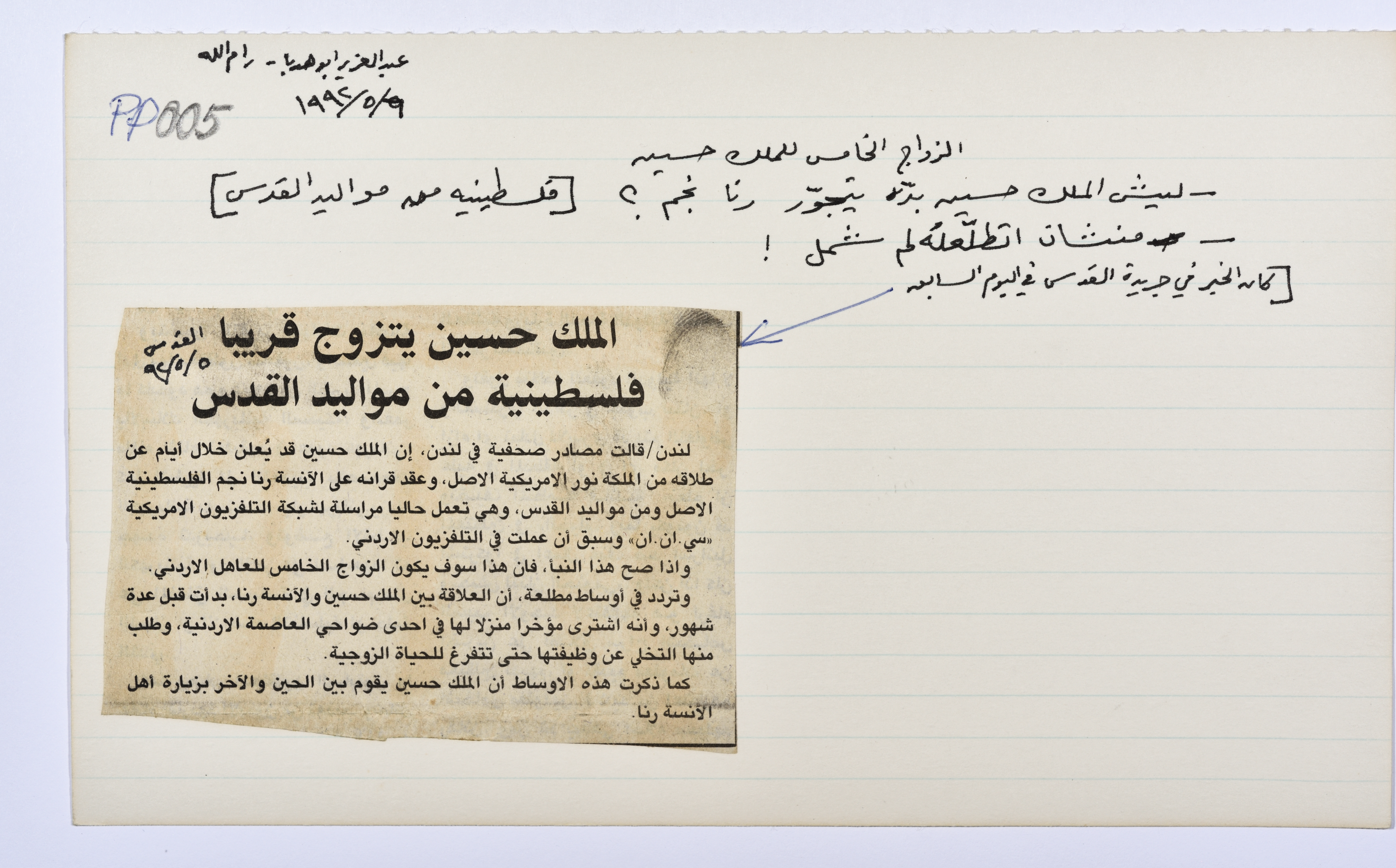 A card documenting a joke entitled "The Marriage of King Hussein"