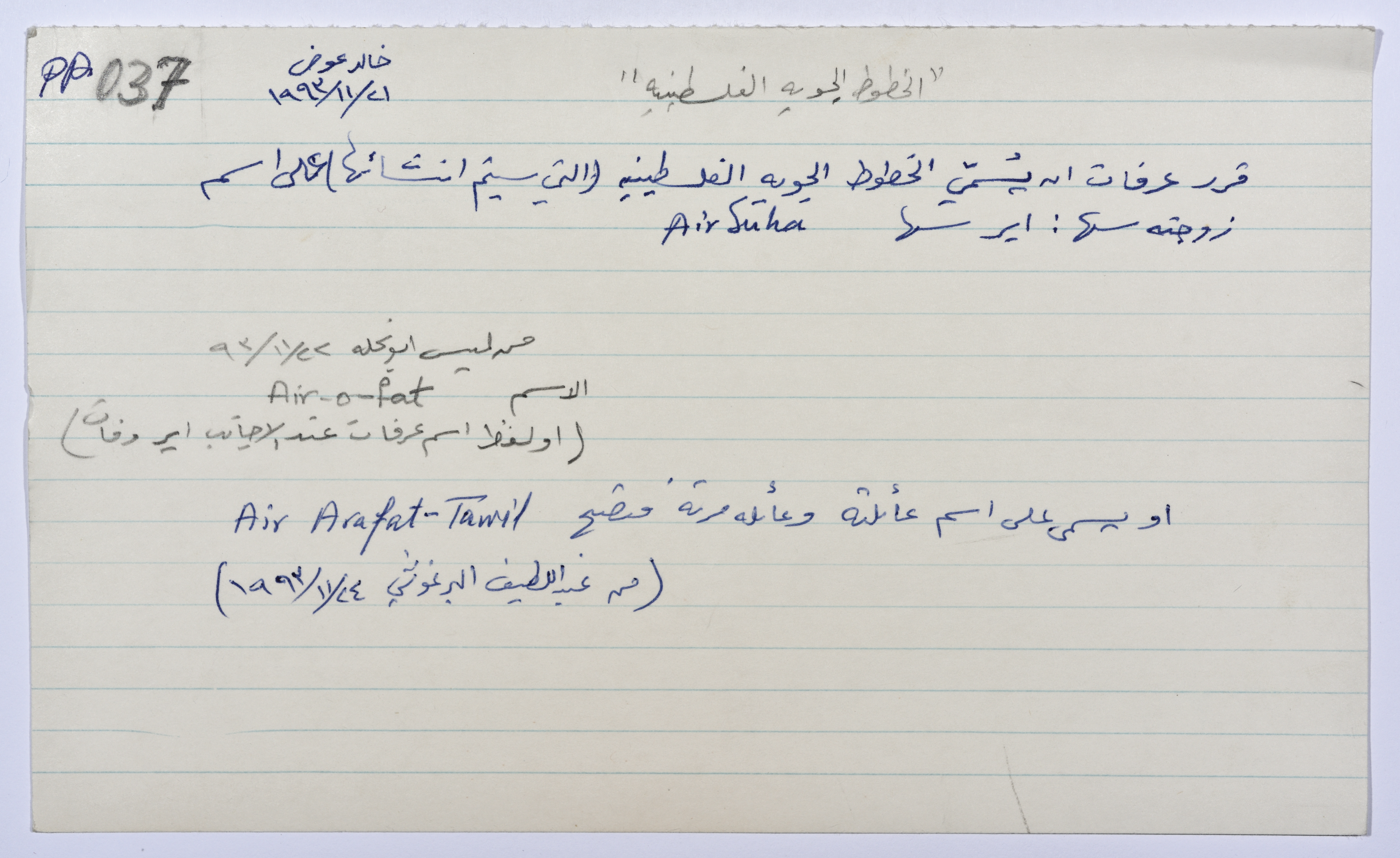 بطاقة وُثِّق عليها نكتة بعنوان "الخطوط الجوية الفلسطينية"