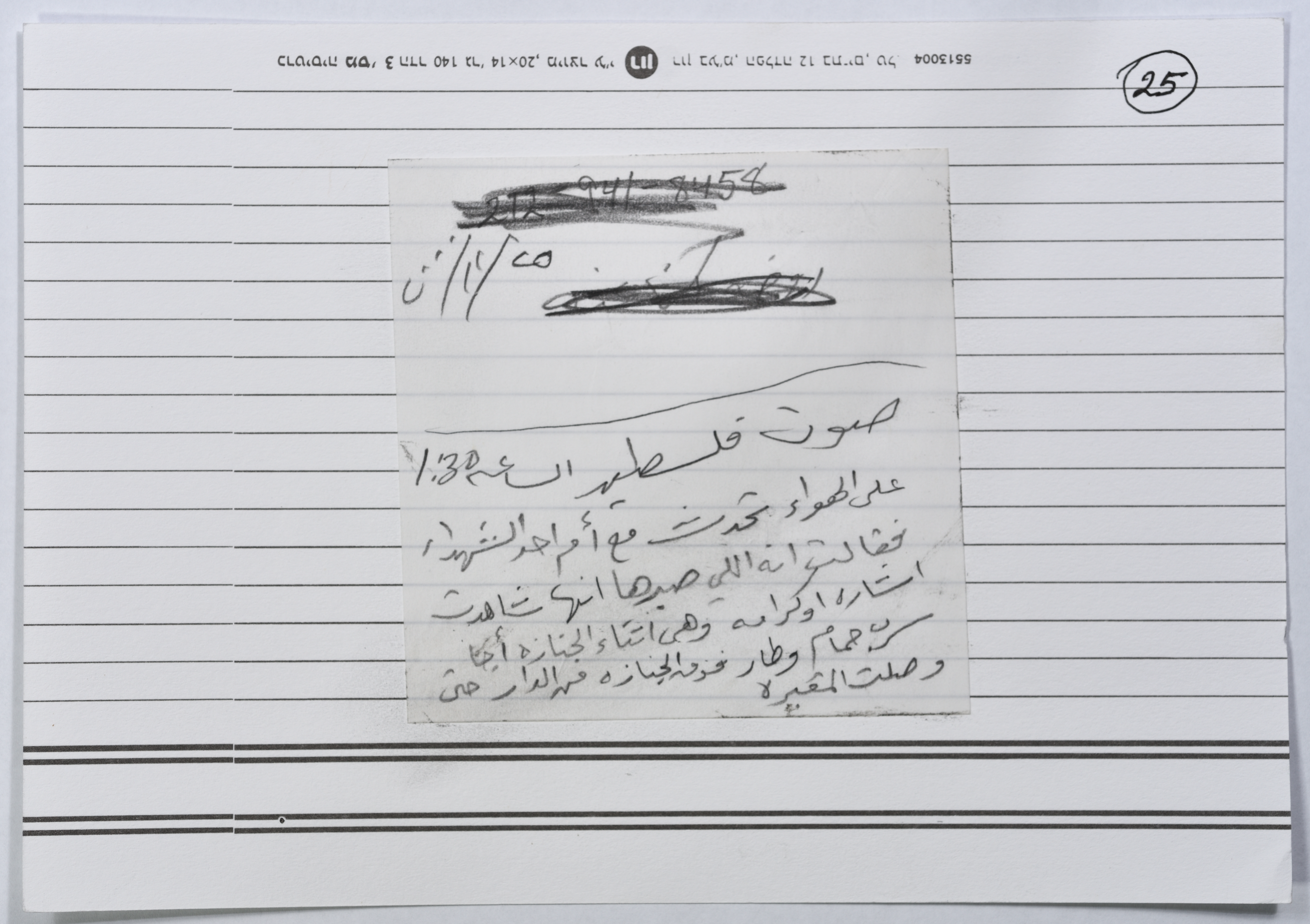 بطاقة وُثِّق عليها حكاية من الانتفاضة بعنوان "حمام فوق الجنازة"
