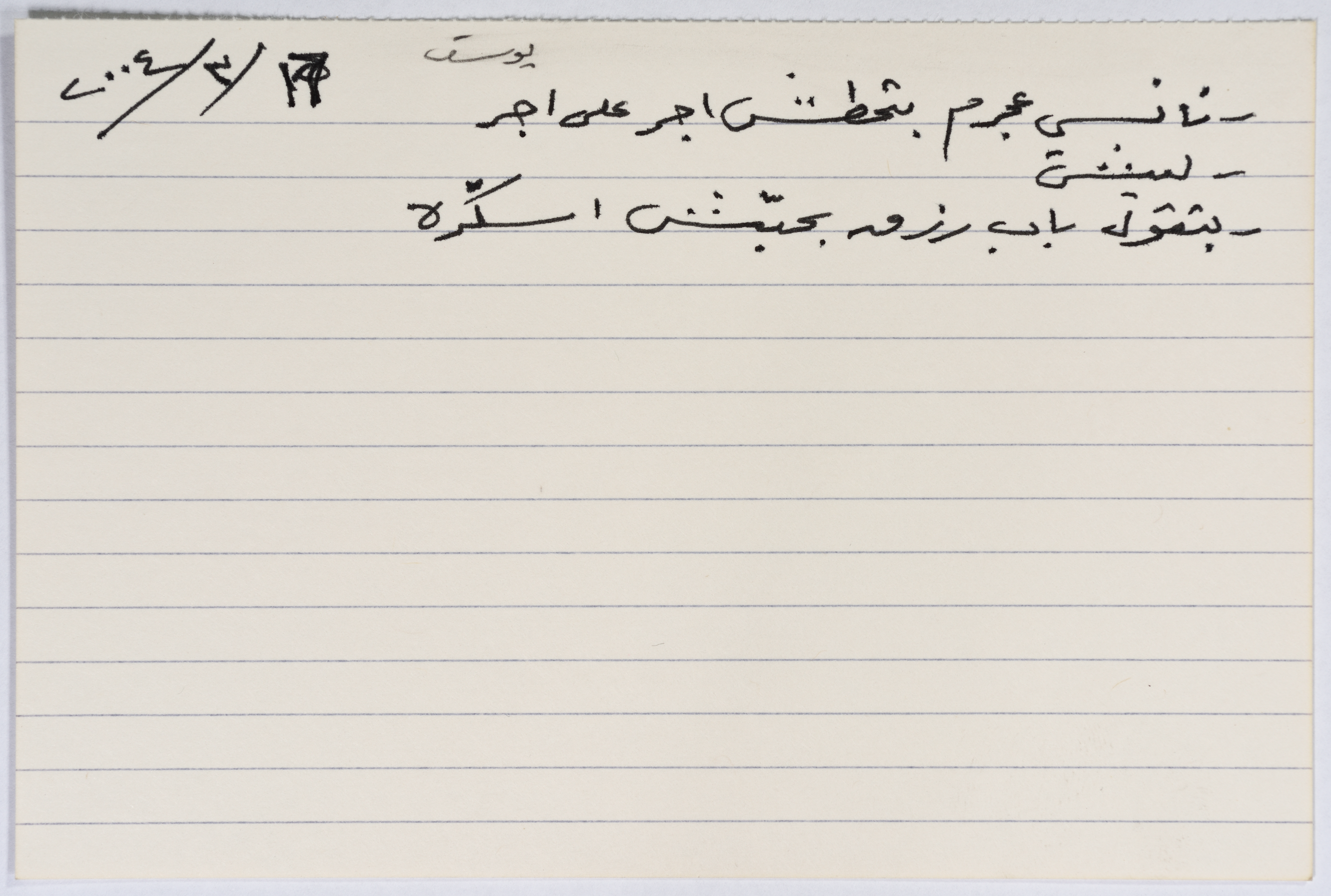 جُمعت هذه النكت من قِبل شريف كناعنة، بدأ بجمعها من أواخر الثمانينيات حتى منتصف العقد الأول من القرن الواحد العشرين. تتضمن البطاقة اسم راوي النكتة ومكان سكنه والتاريخ.