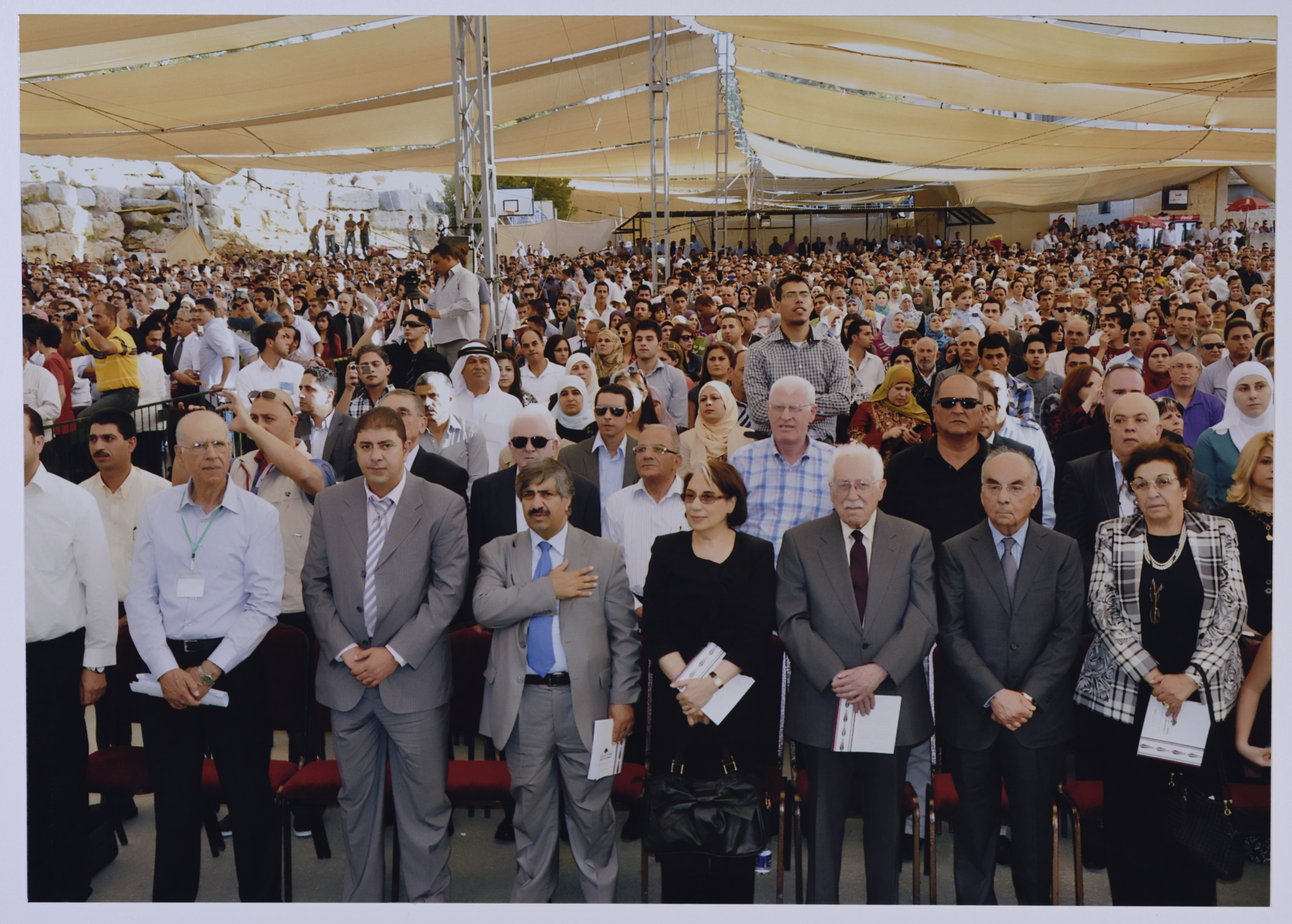 A colour photograph of Mr. Ibrahim Dakkak when he was awarded an Honorary Doctorate in Community Development from Birzeit University during the 37th Annual Graduation Ceremony in recognition of his years of service in many cultural, political and professional areas, especially his leading role in the presidency of Birzeit University's Board of Trustees. Ibrahim Dakkak was elected as Chairman of the University's Board of Trustees in 1973. He assumed the presidency of the Board of Trustees of the University again between 2003-2006