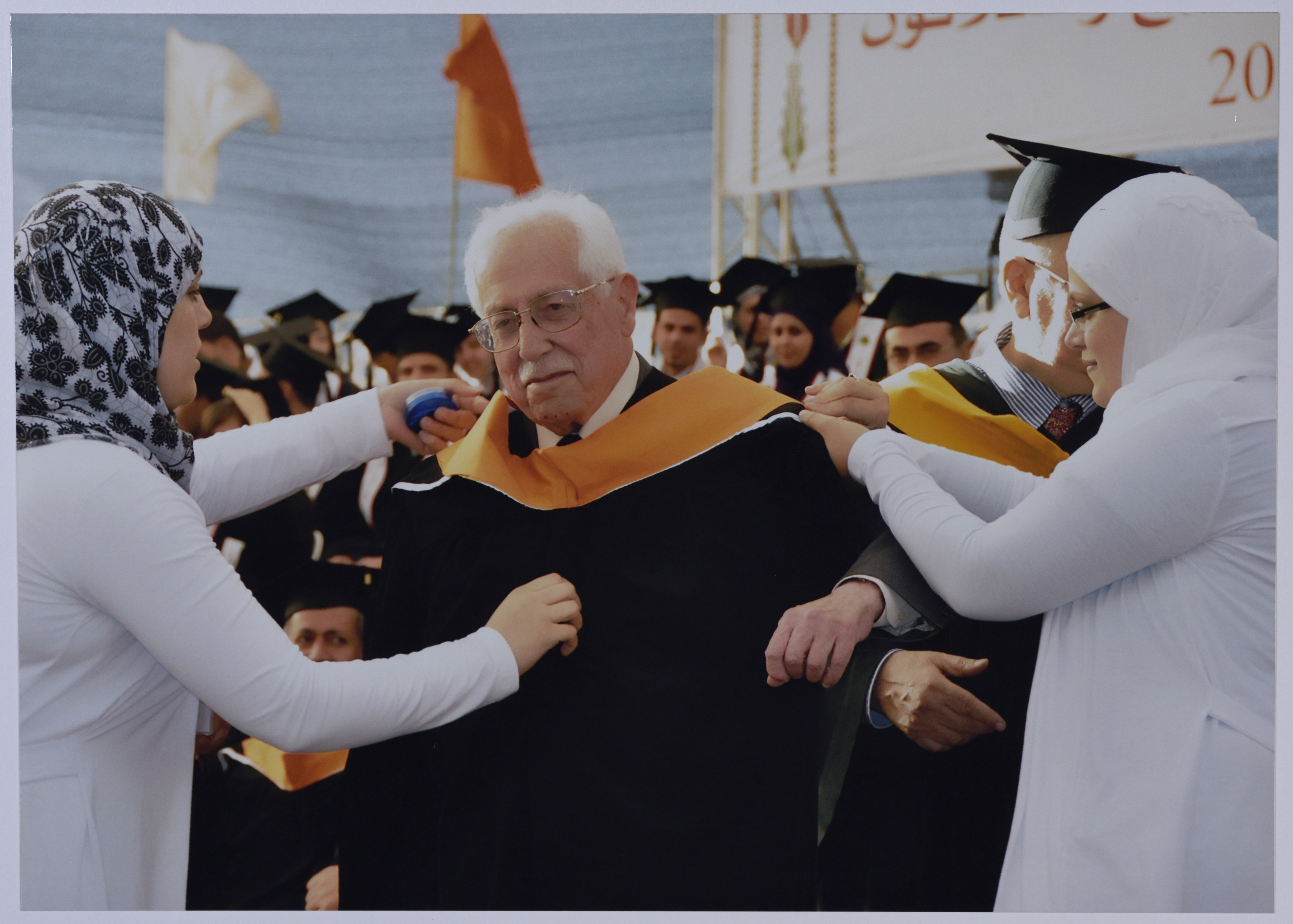 A colour photograph of Mr. Ibrahim Dakkak when he was awarded an Honorary Doctorate in Community Development from Birzeit University during the 37th Annual Graduation Ceremony in recognition of his years of service in many cultural, political and professional areas, especially his leading role in the presidency of Birzeit University's Board of Trustees. Ibrahim Dakkak was elected as Chairman of the University's Board of Trustees in 1973. He assumed the presidency of the Board of Trustees of the University again between 2003-2006
