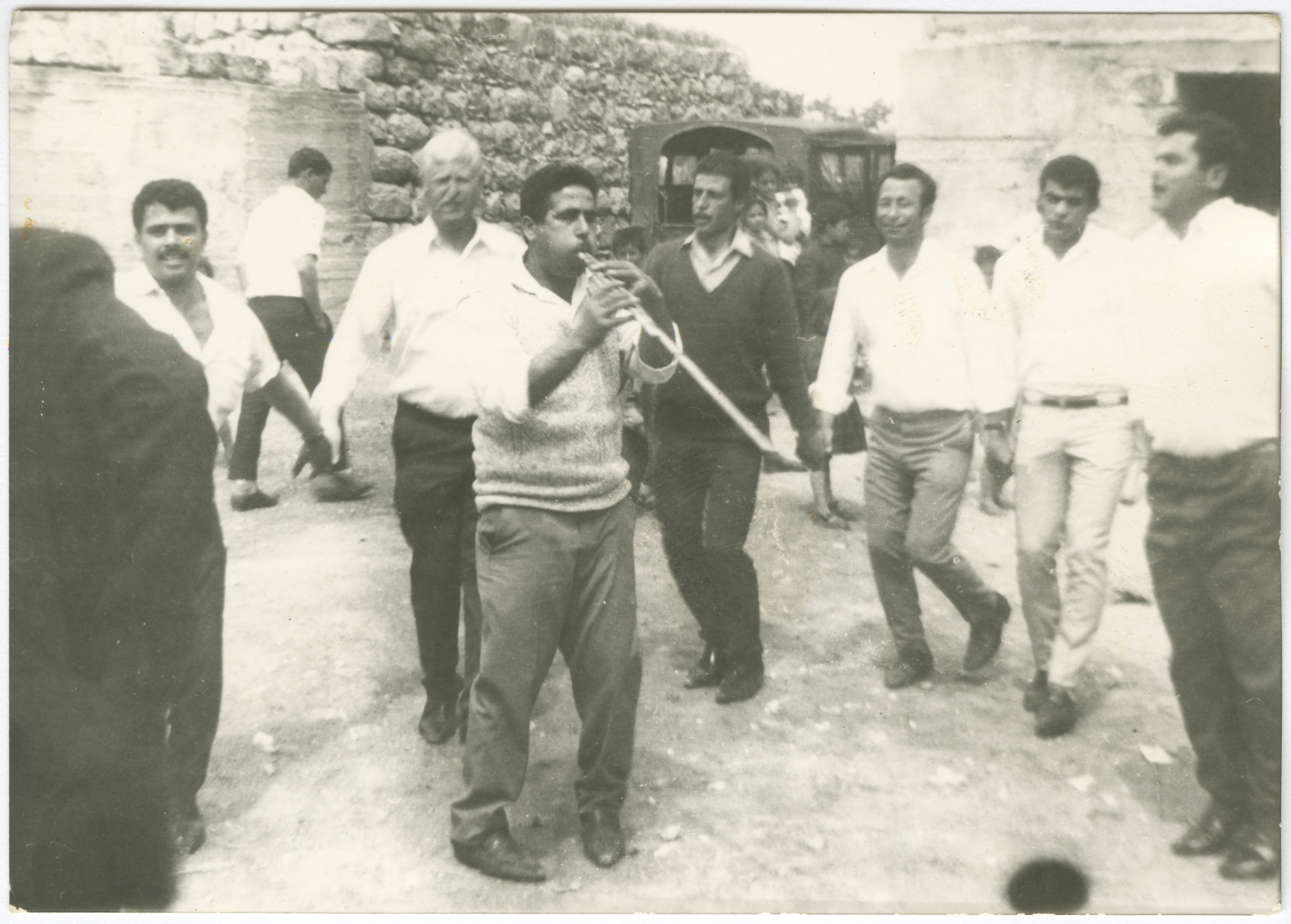 A group of men dancing the Palestinian Dabkeh in the weeding of Khaled Bakariya from Arrabeh.