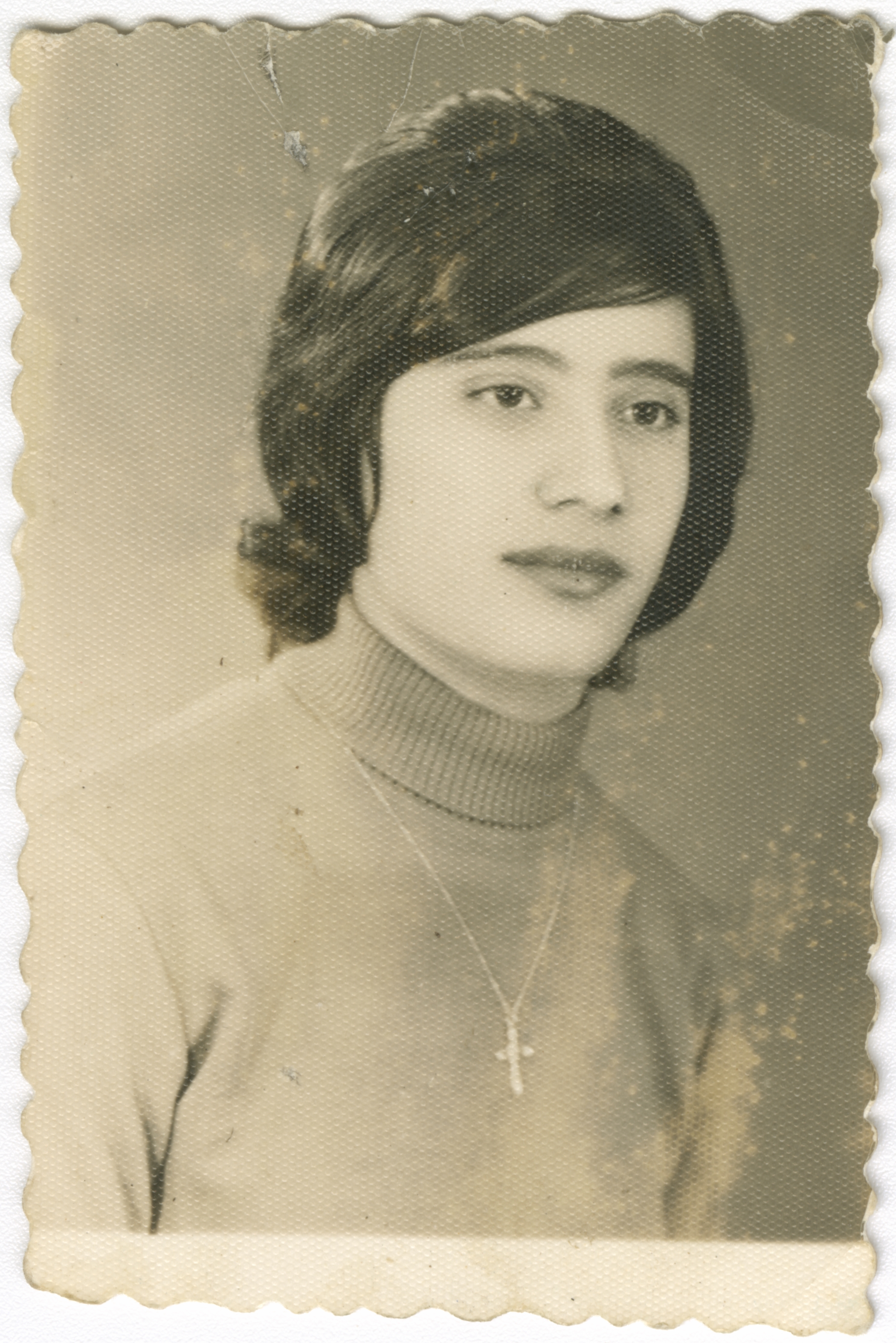 Taken in a studio in Nazareth in 1968, this black-and-white photograph shows Nihad Eissa from al-Jash village in the Galilee.