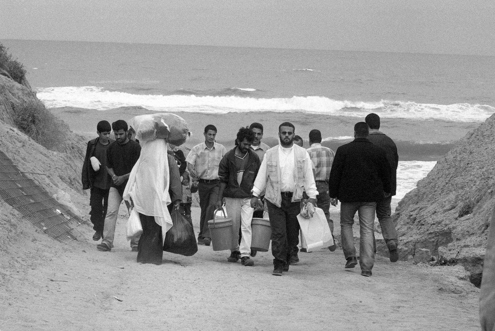 صورة غير ملونة لفلسطينيين يمرّون من طريق عبر الشاطئ بعد أغلاق قوات الاحتلال "الإسرائيلي" للطرق في غزة خلال الانتفاضة الثانية.