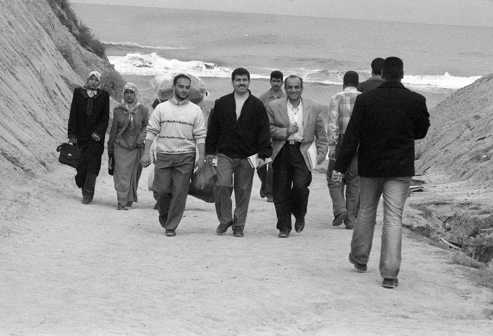 Taken during the Second Intifada, this black-and-white photograph of Palestinians forced to take a road on the beach, after the "Israeli" Occupation Forces closed the roads in Gaza.