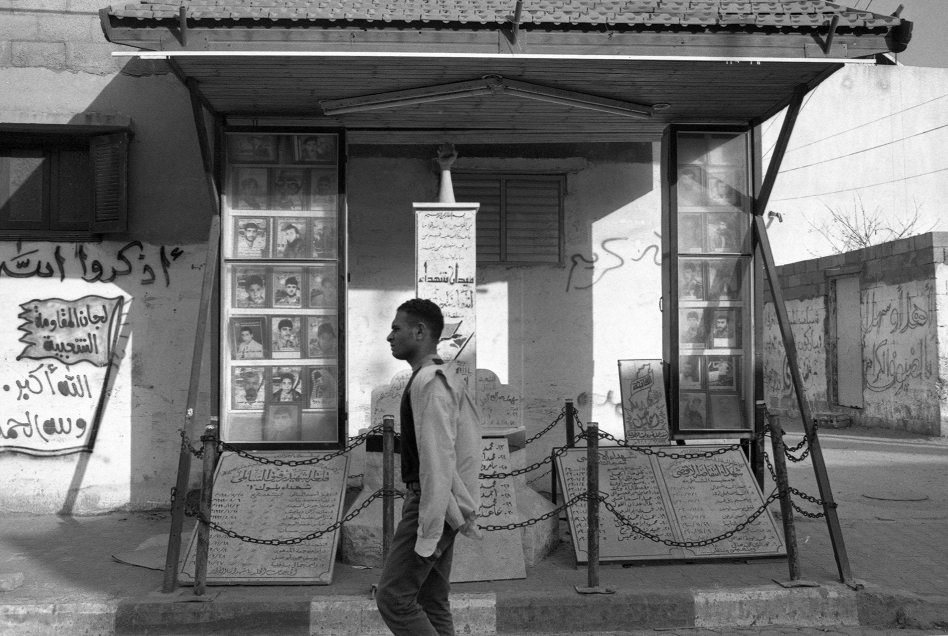 Taken during the Second Intifada, this black-and-white photograph captures murals depicting shaheeds in al-Shati Palestinian Refugee Camp.