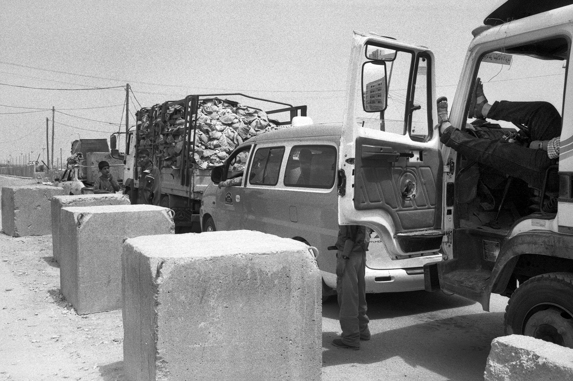 صورة غير ملونة يظهر فيها حاجز الاحتلال "الإسرائيلي" أبو هولي، الواقع بين دير البلح وخان يونس في غزة، الانتفاضة الثانية.