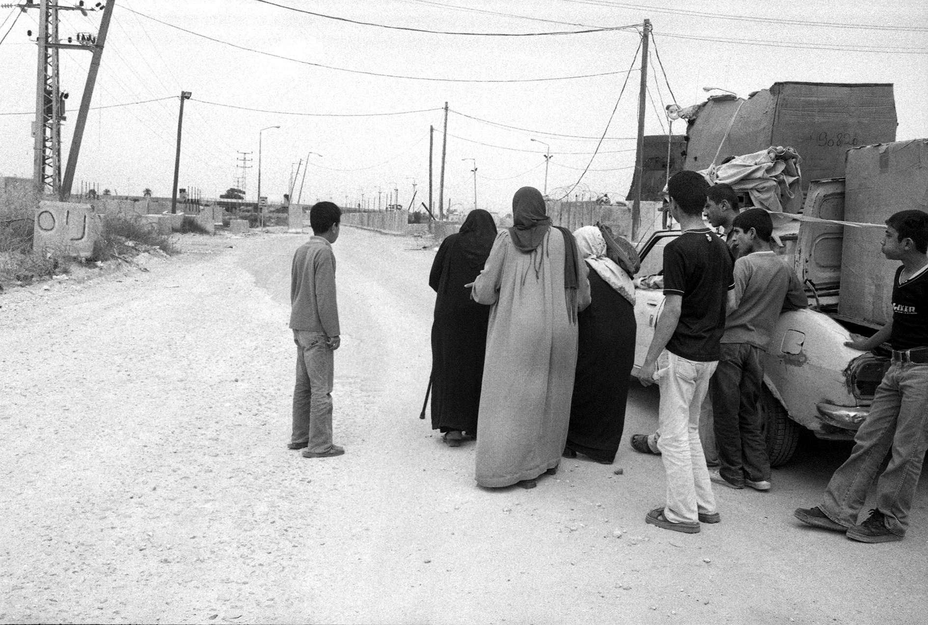 صورة غير ملونة يظهر فيها حاجز الاحتلال "الإسرائيلي" أبو هولي، الواقع بين دير البلح وخان يونس في غزة، الانتفاضة الثانية.