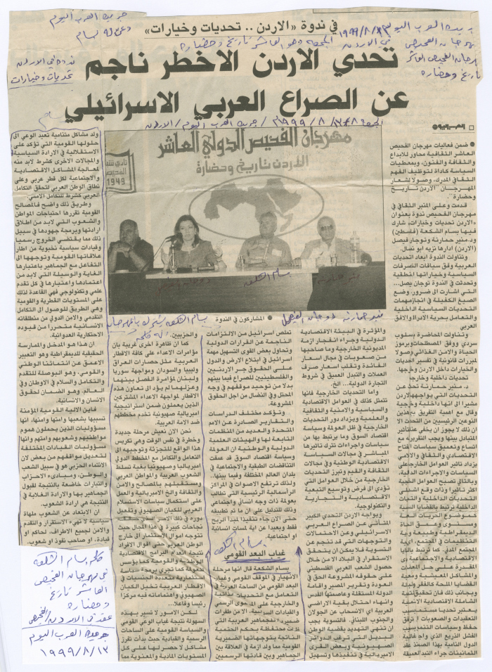 "تحدي الأردن الأخطر ناجم عن الصراع العربي الإسرائيلي"، صفحة من جريدة العربي اليوم، 13 آب 1999