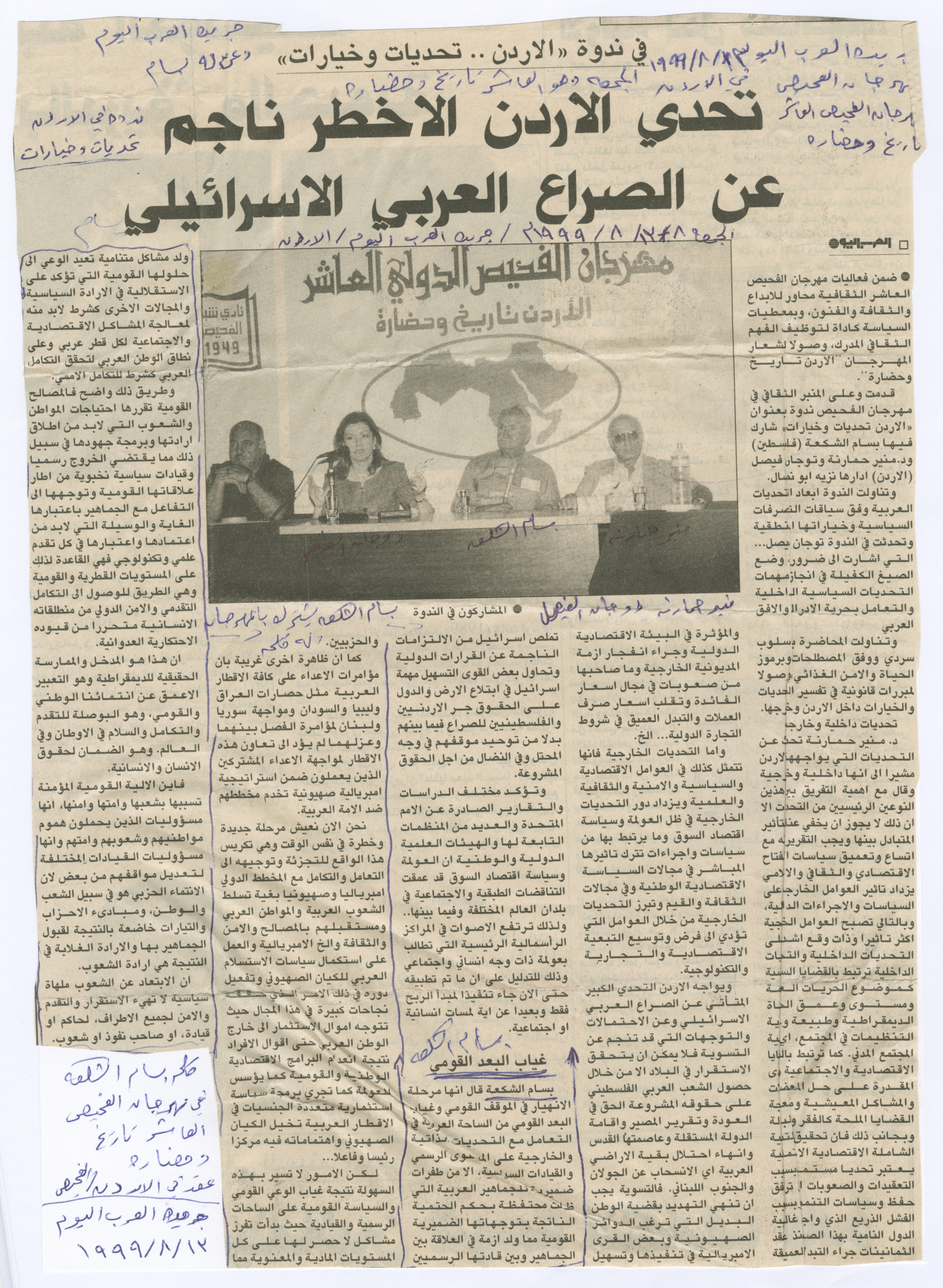 صفحة من جريدة العربي اليوم، بتاريخ 13 آب 1999، تتضمن خبراً حول مشاركة بسّام الشكعة، إلى جانب توجان الفيصل ومنير حمارنة ونزيه أبو نضال، في ندوة بعنوان (الأردن تحديات وخيارات) ضمن فعاليات مهرجان الفحيص الدولي العاشر. تمحورت مداخلة الشكعة حول البعد القومي وعلاقته بقضايا الثقافة ومقاومة الإمبريالية العالمية والاحتلال الإسرائيلي.