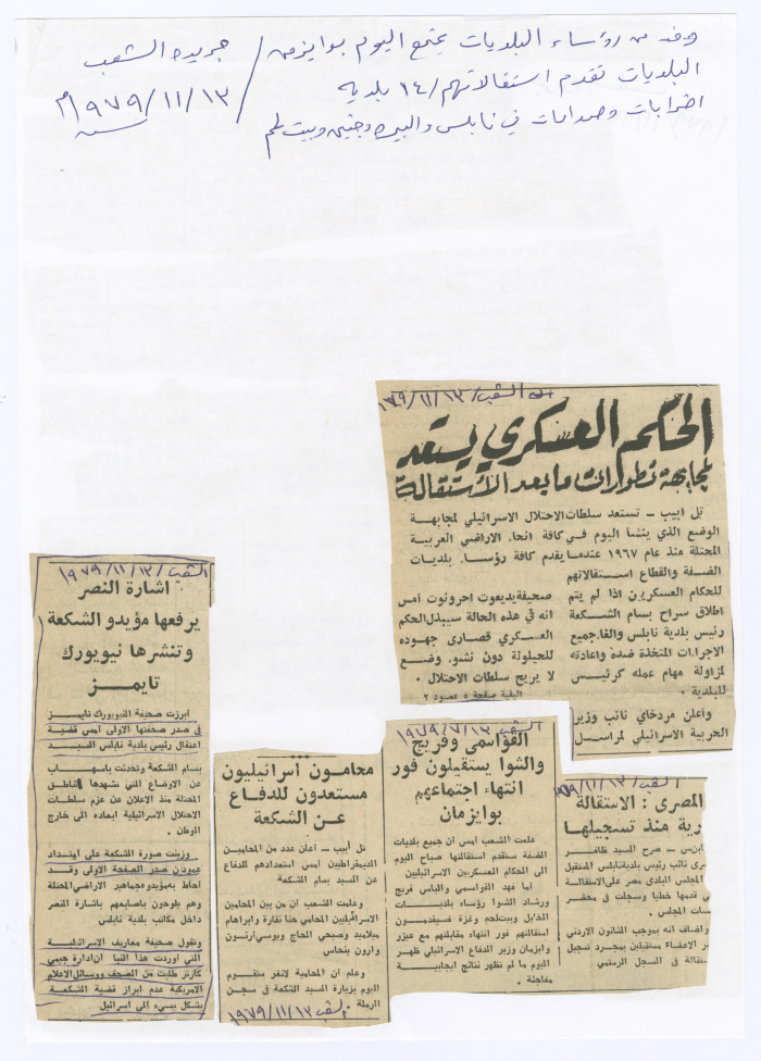 Issued on 13 November 1979, these clippings from ash-Sha'b Newspaper, entitled "The Military Rule Braces Itself for the Post-Resignation Developments", feature news articles about the resignation of the municipal councils in the West Bank and the Gaza Strip following the detention by the Israeli Occupation Authorities of Bassam Shakaa, mayor of Nablus, and their attempt to force him into exile.