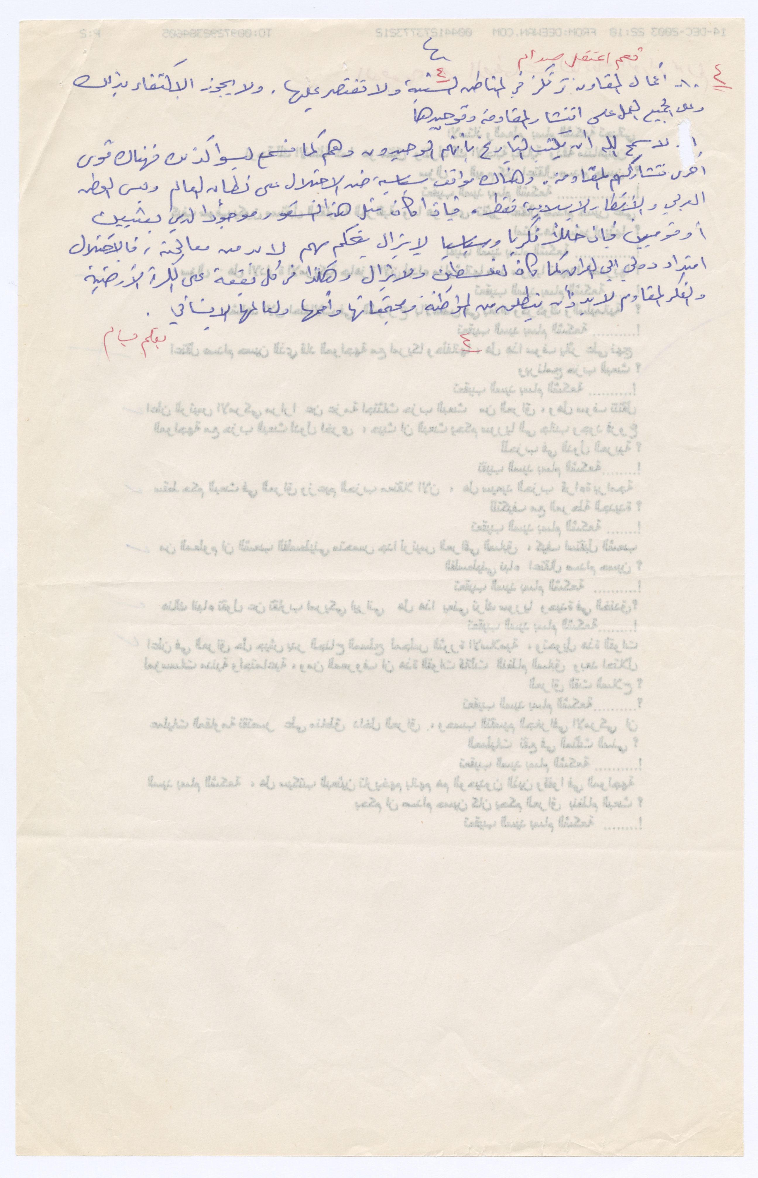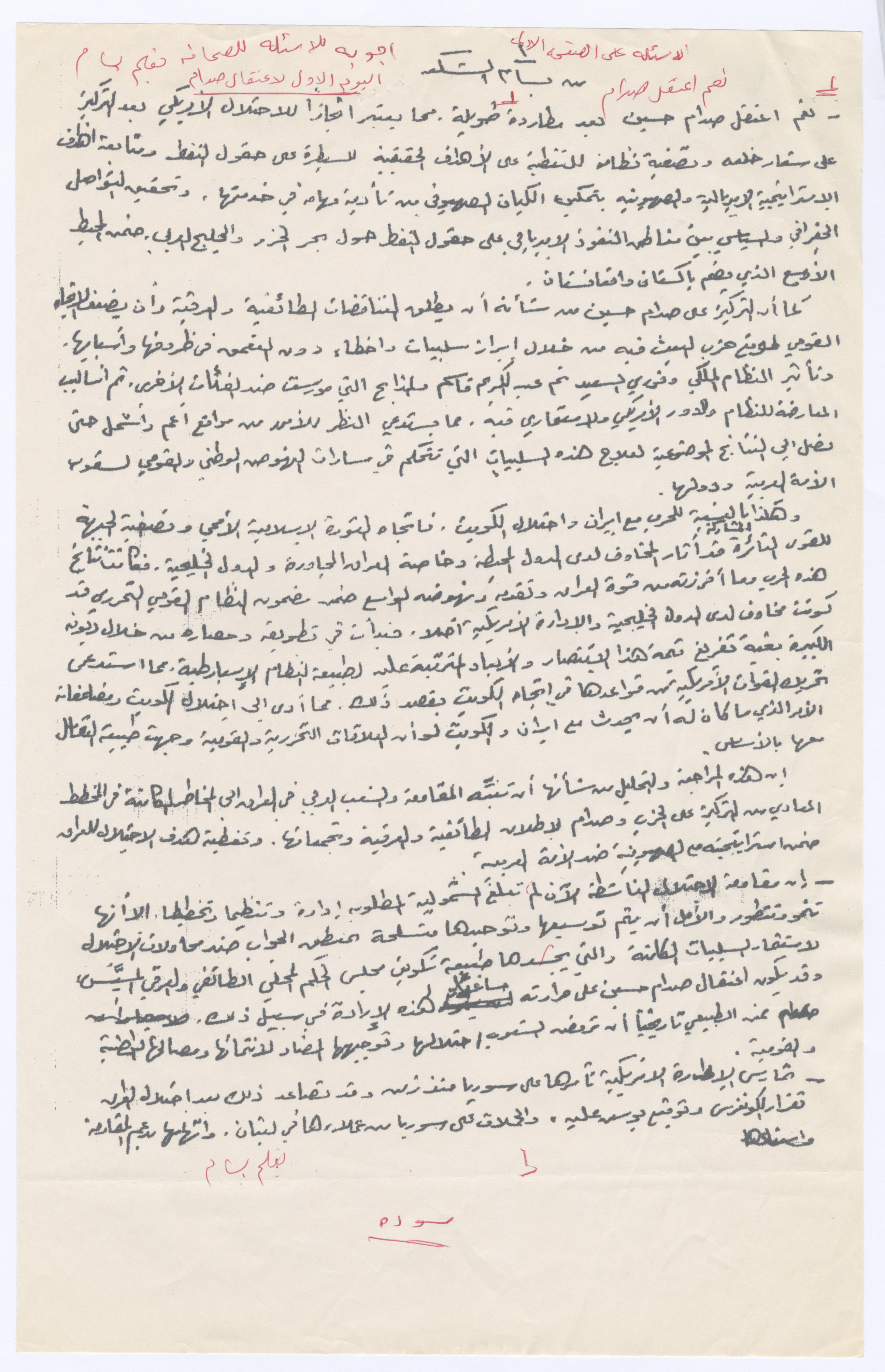 مقابلة صحفية مع بسام الشكعة (أسئلة وجهت له ومسودة إجاباته) بتاريخ 14 كانون الأول 2003، حول ظروف العراق عقب الغزو الأمريكي البريطاني واعتقال الرئيس العراقي صدام حسين، وتوقعاته لمستقبل العراق.