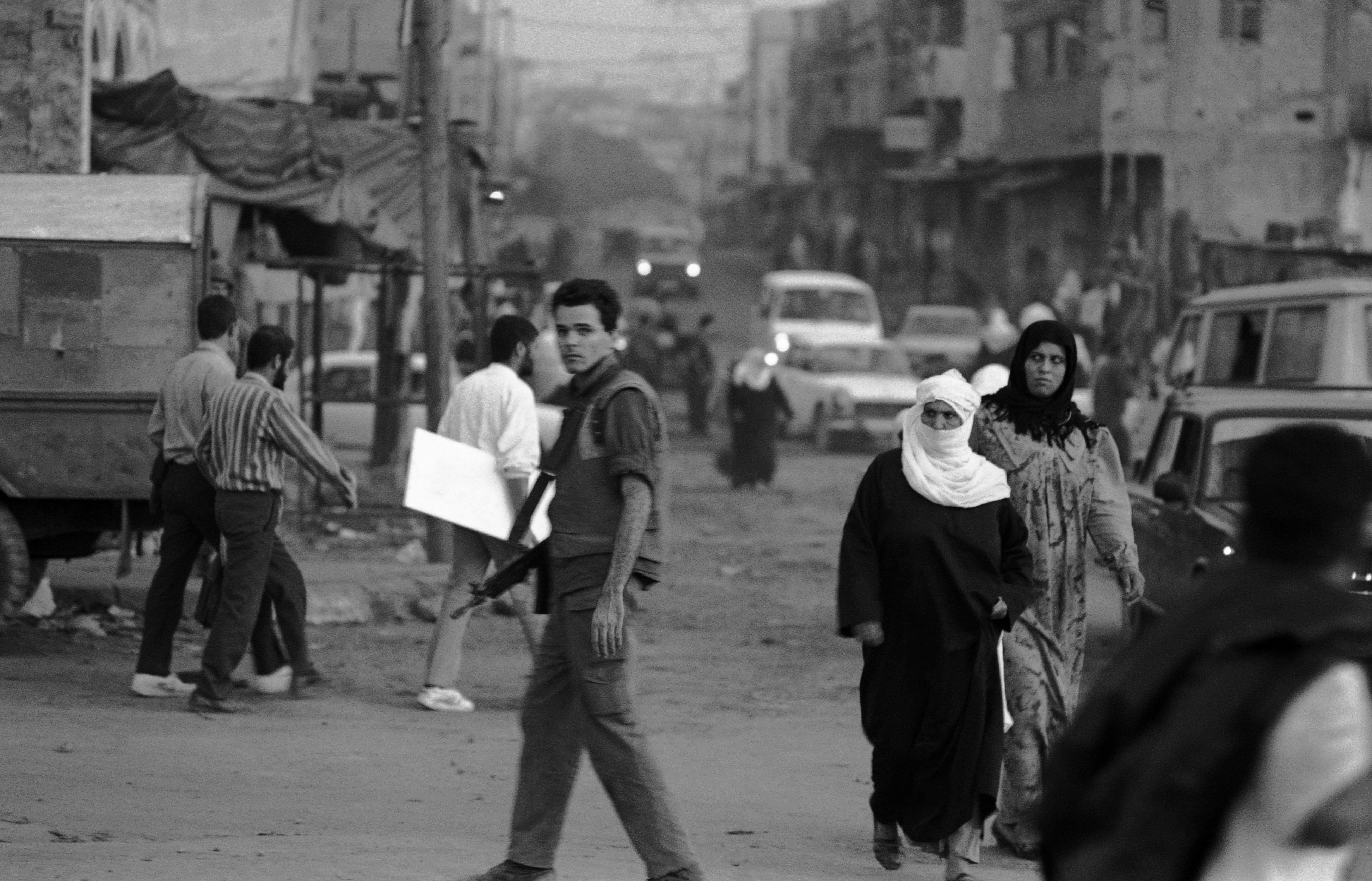 صورة غير ملونة لأشخاص يقضون احتياجاتهم اليومية في حي الشجاعية-غزة المحتلة.