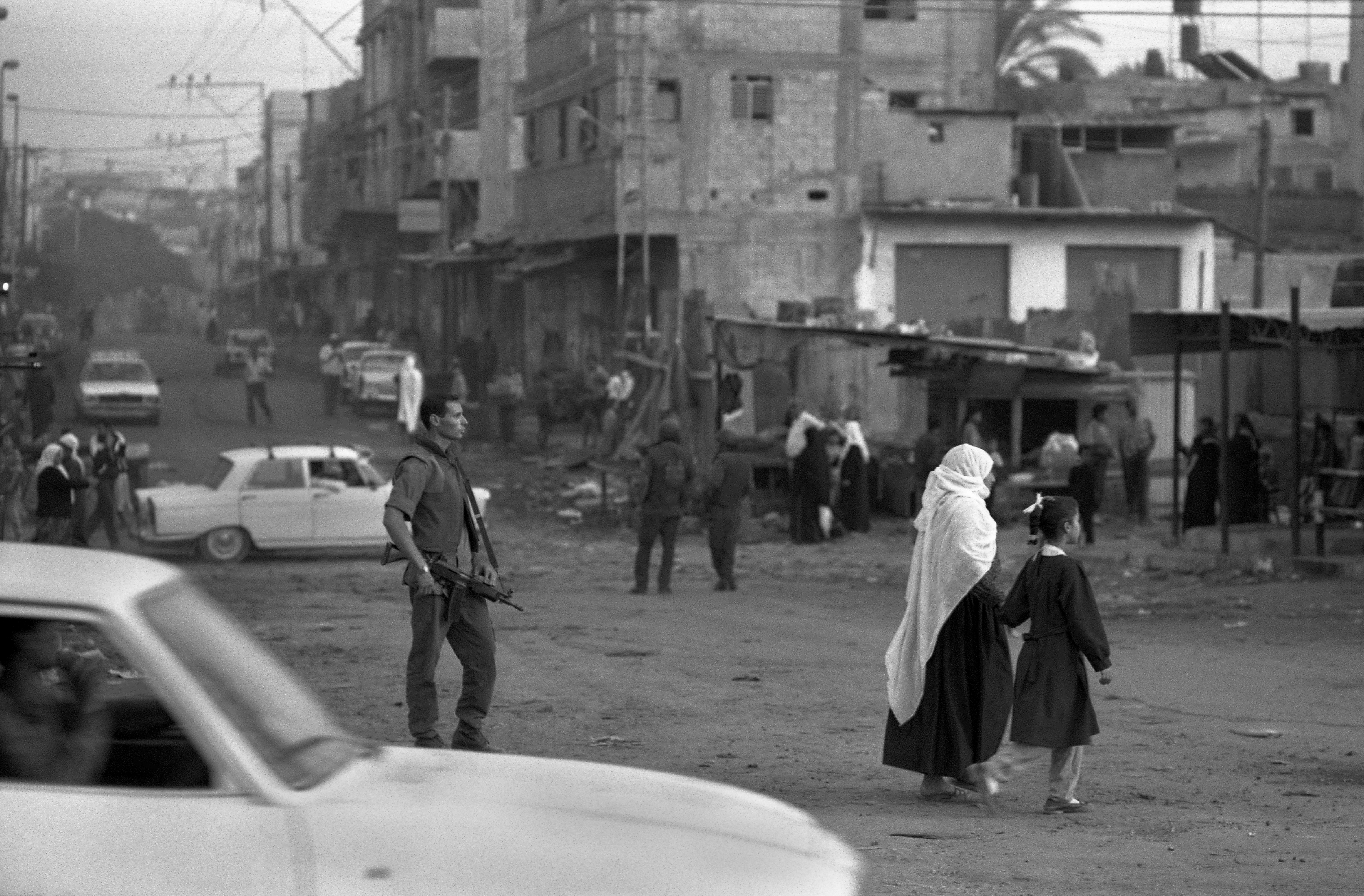 صورة غير ملونة لأشخاص يقضون احتياجاتهم اليومية في حي الشجاعية-غزة المحتلة.