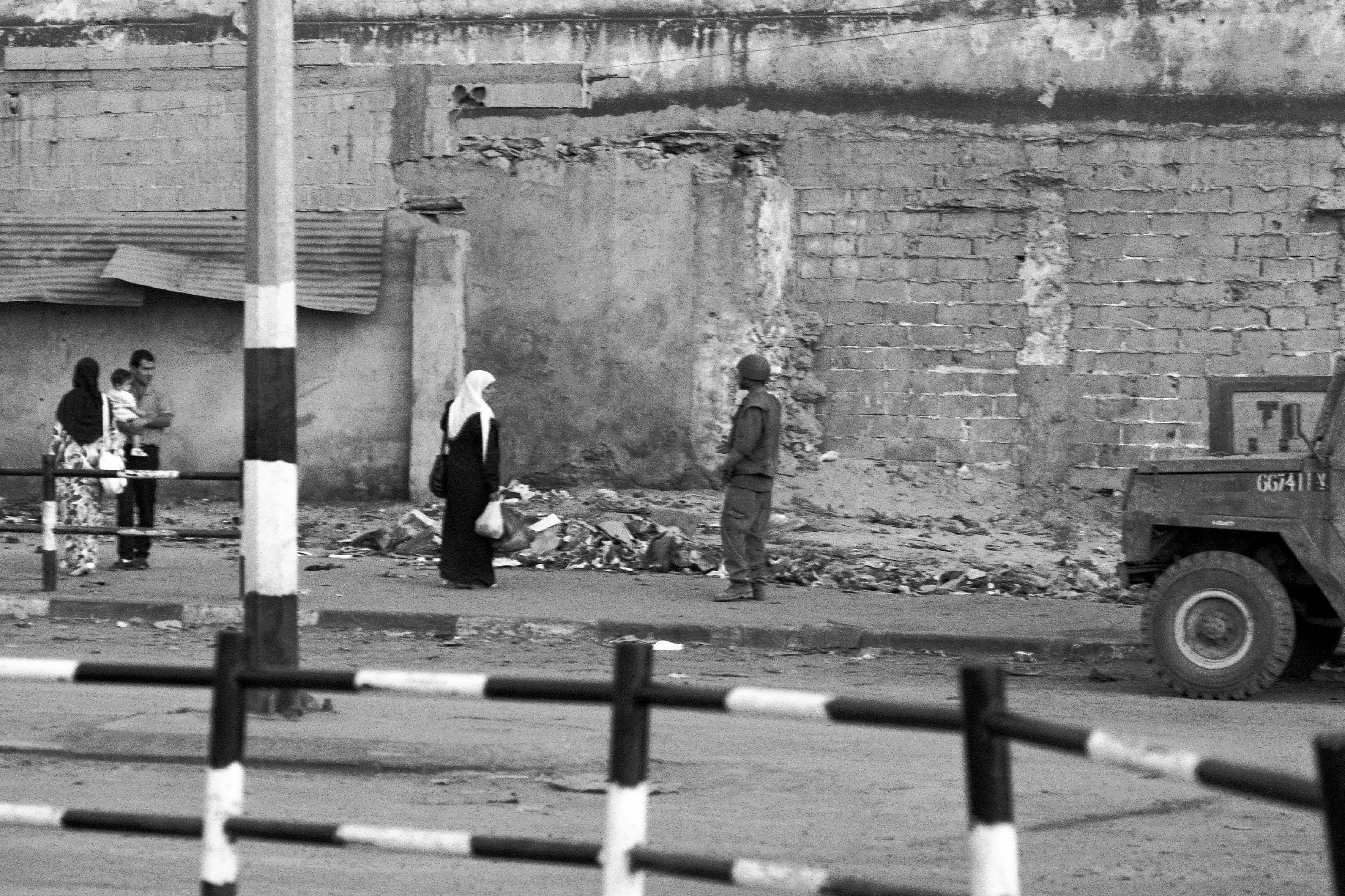 صورة غير ملونة لأشخاص يقضون احتياجاتهم اليومية في حي الشجاعية-غزة المحتلة.
