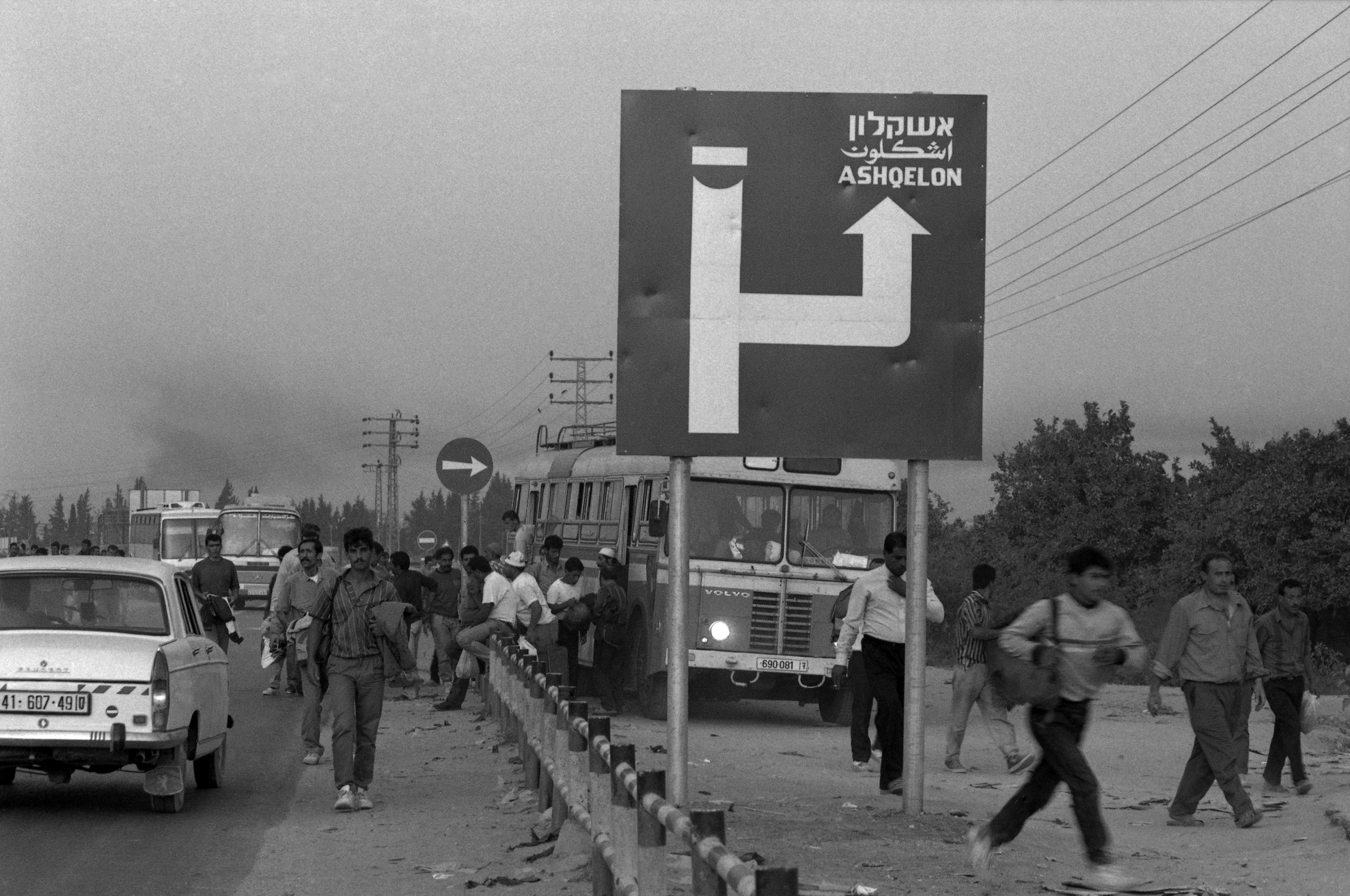A black-and-white photograph of Palestinian labourer working in 1948 territories heading back to Gaza after work.