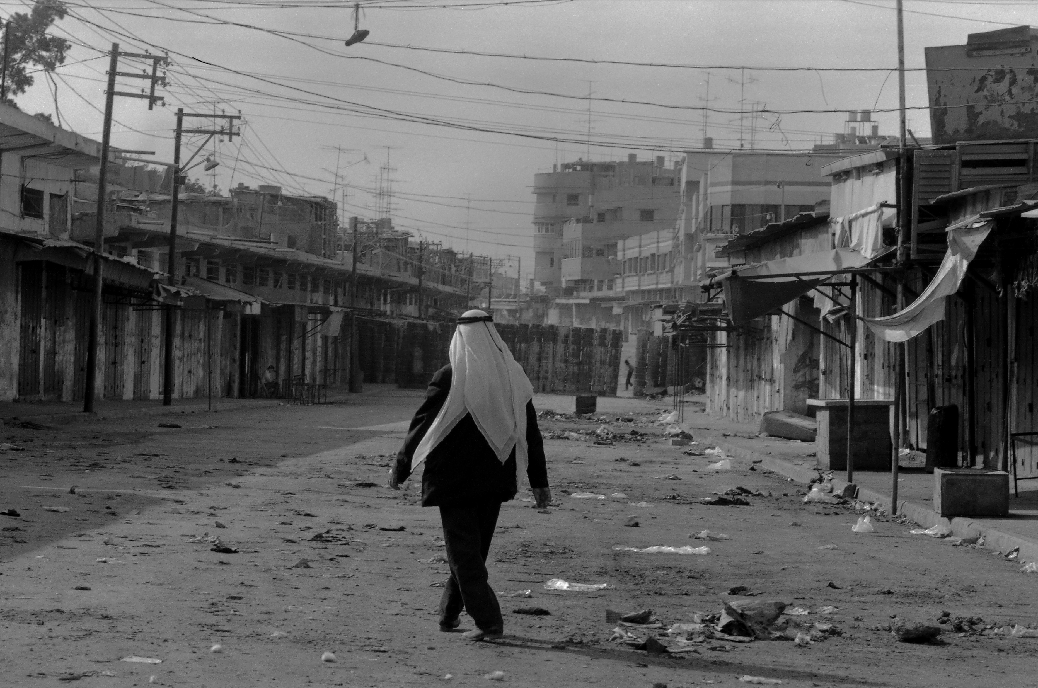 Taken during a general strike in Gaza, a black-and-white photograph of the Palestine Square "Midan Falasteen".