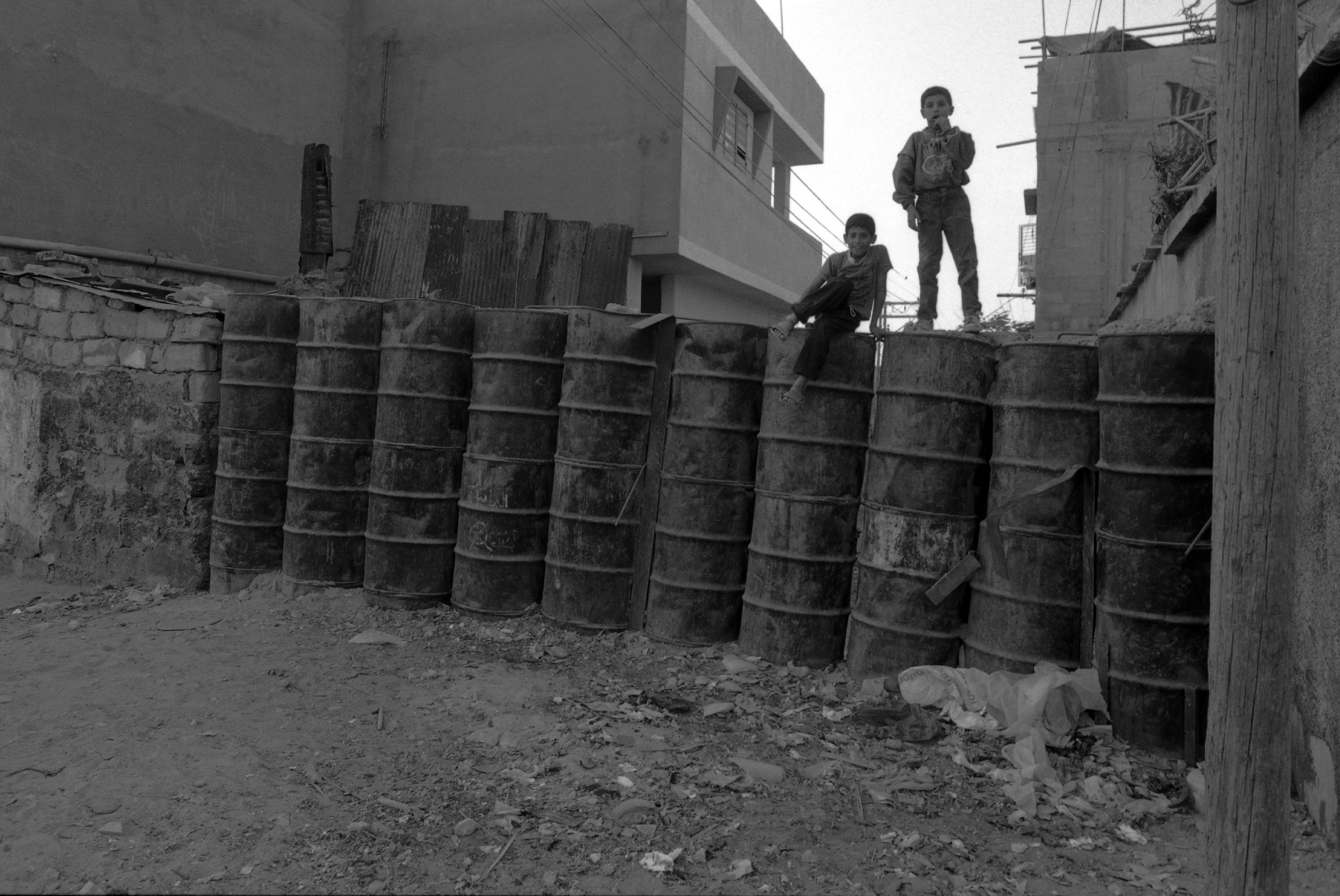 صورة غير ملونة لطفلين يلعبان، غزة.