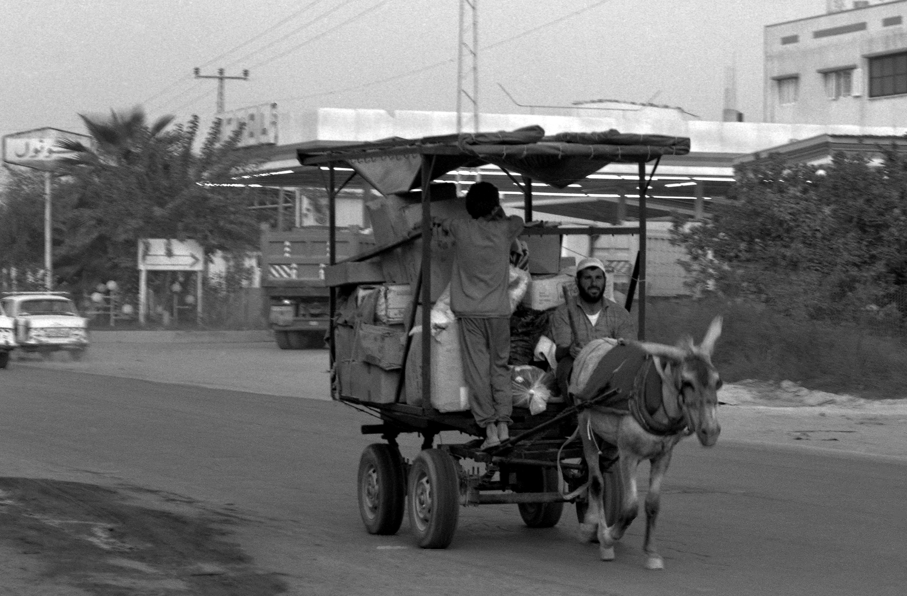 صورة غير ملونة لأب يقود عربة في شوارع غزة برفقة ولده.