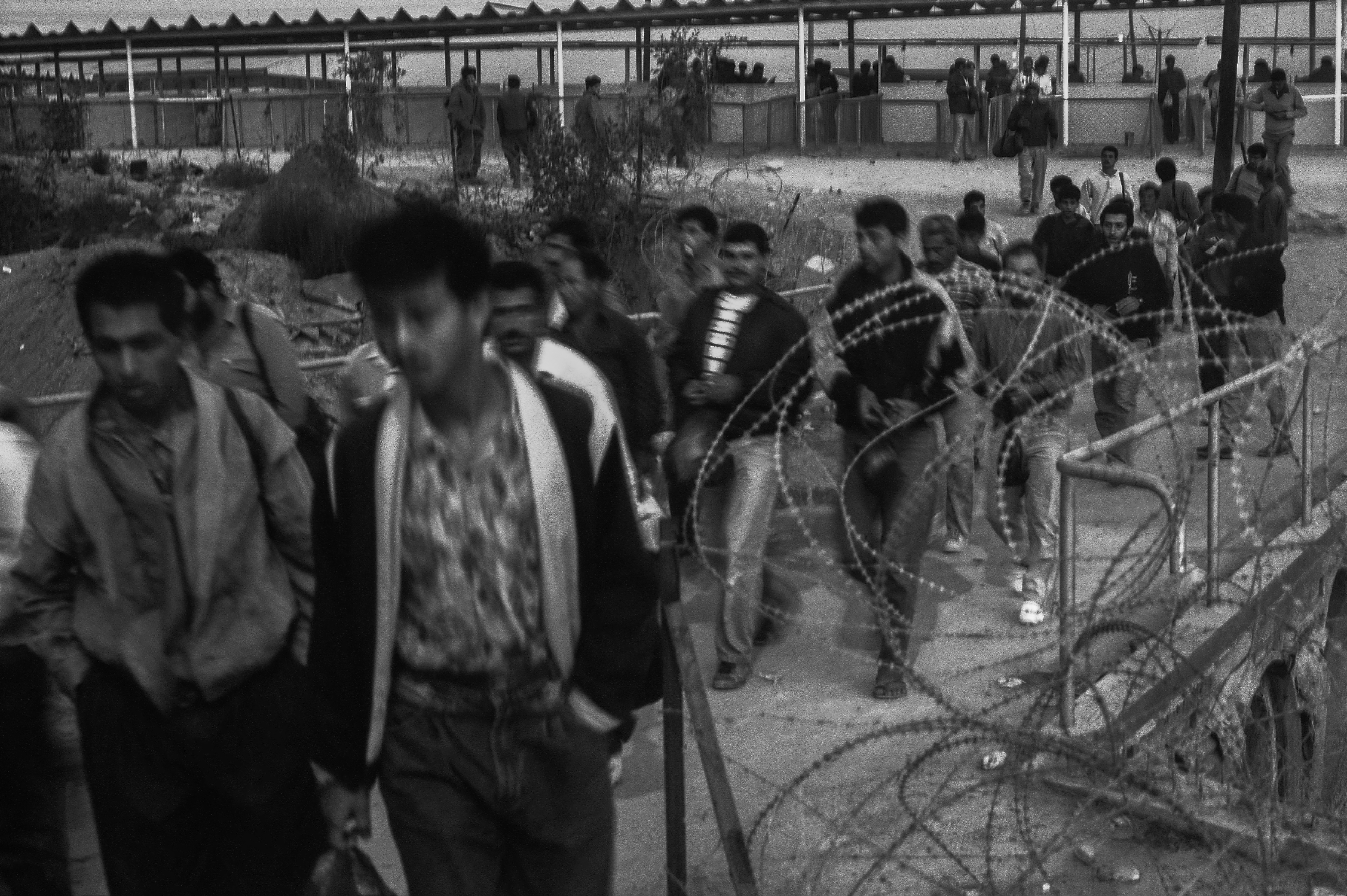 صورة غير ملونة لعمّال غزّاويين يعبرون حاجز بيت حانون من أجل العمل في الأراضي الفلسطينية المحتلة عام 1948.