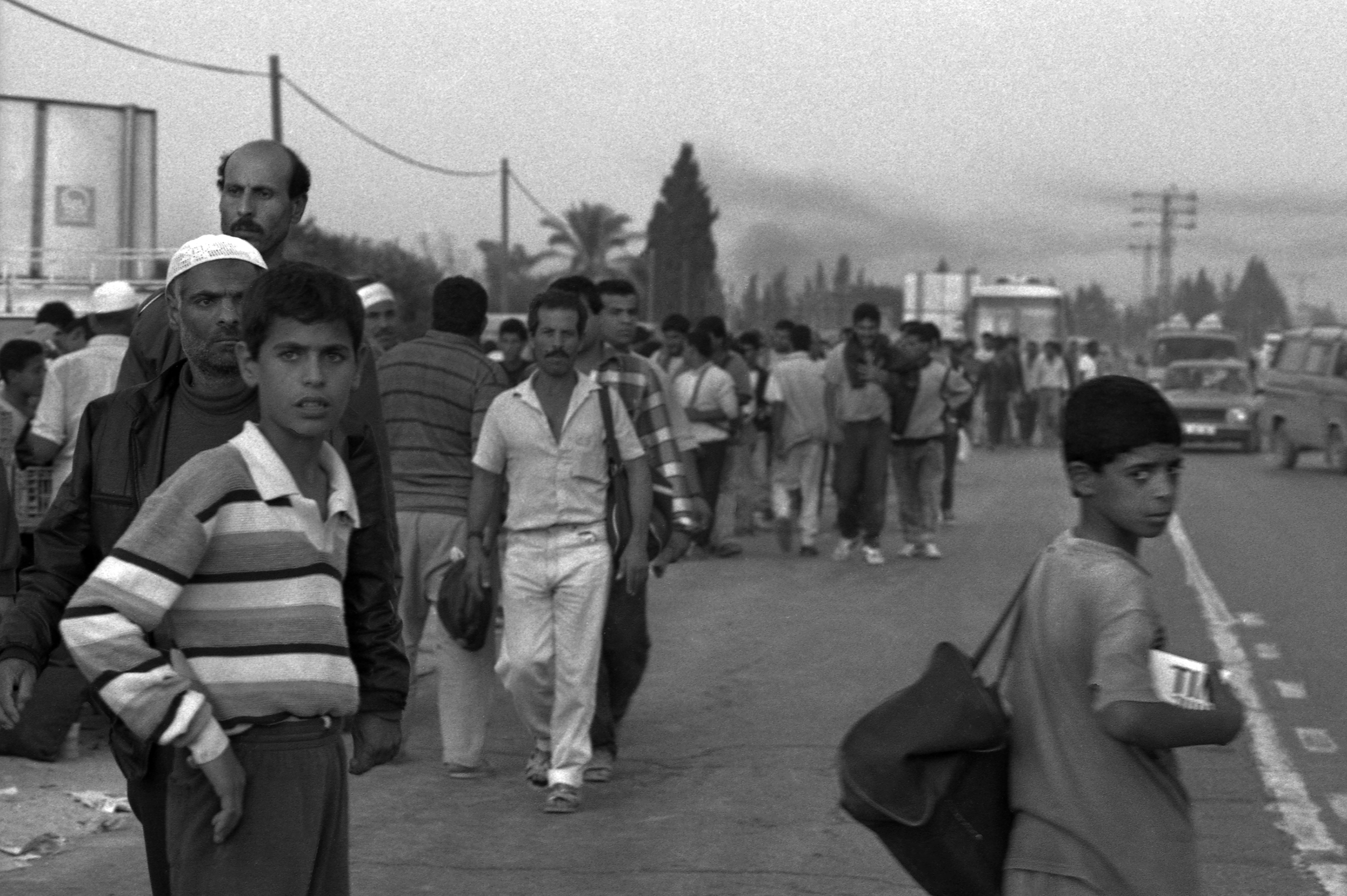 صورة غير ملونة لبائع متجول صغير يبيع السجائر للعمال العائدين من الأراضي الفلسطينية المحتلة عام 1948 في غزة.