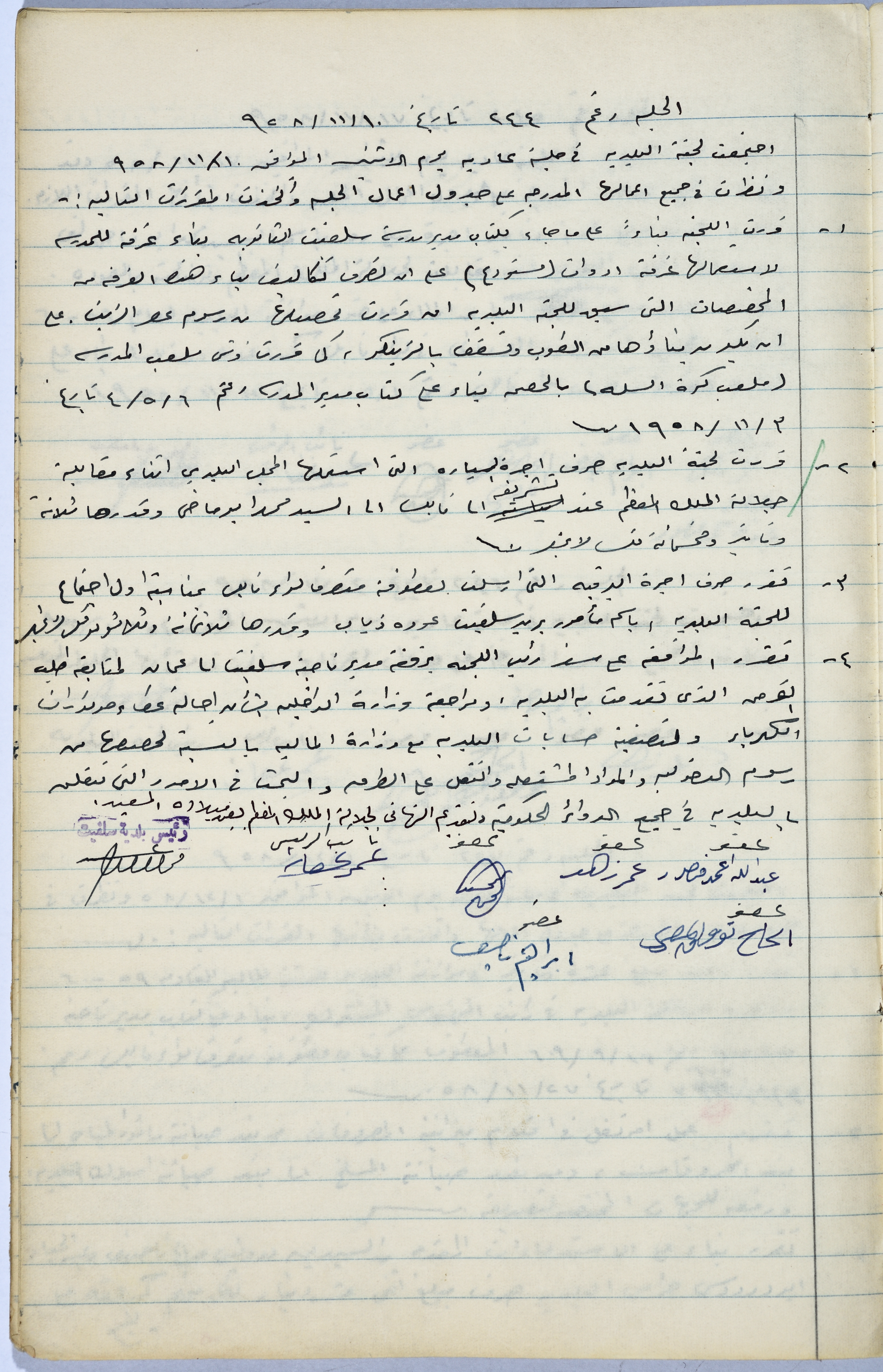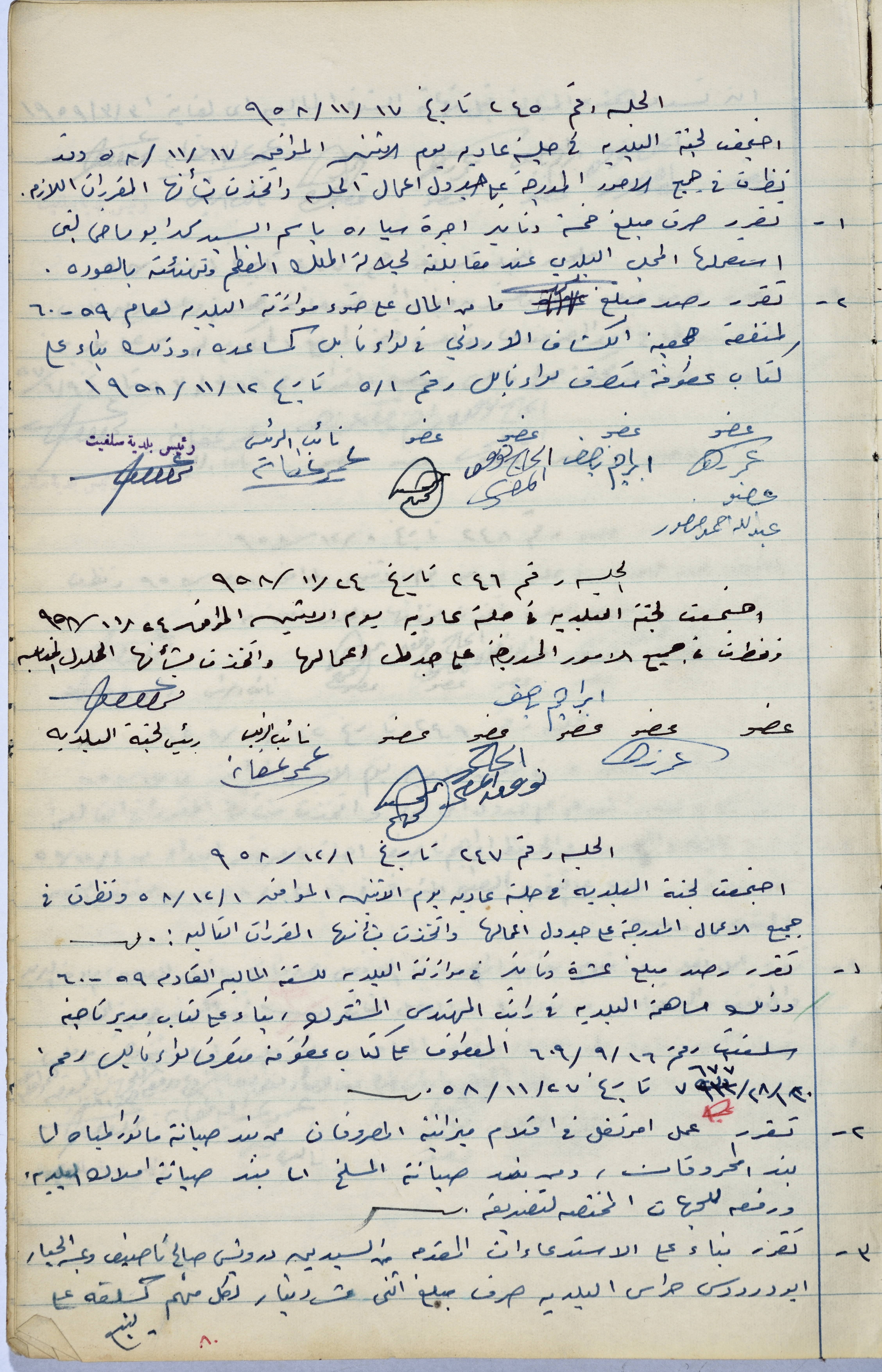 Handwritten during the period from 11 November to 22 December 1958, this document shows the minutes of sessions No. 244, 245, 246, 247, 248 and 249, convened by the Salfit Municipal Committee in the course of this period. During these sessions, the Committee made several decisions, including constructing a room that would serve as a warehouse for the Salfit Secondary School, raising the minimum water fee from 100 fils to 150 fils and amending some items in the budget.