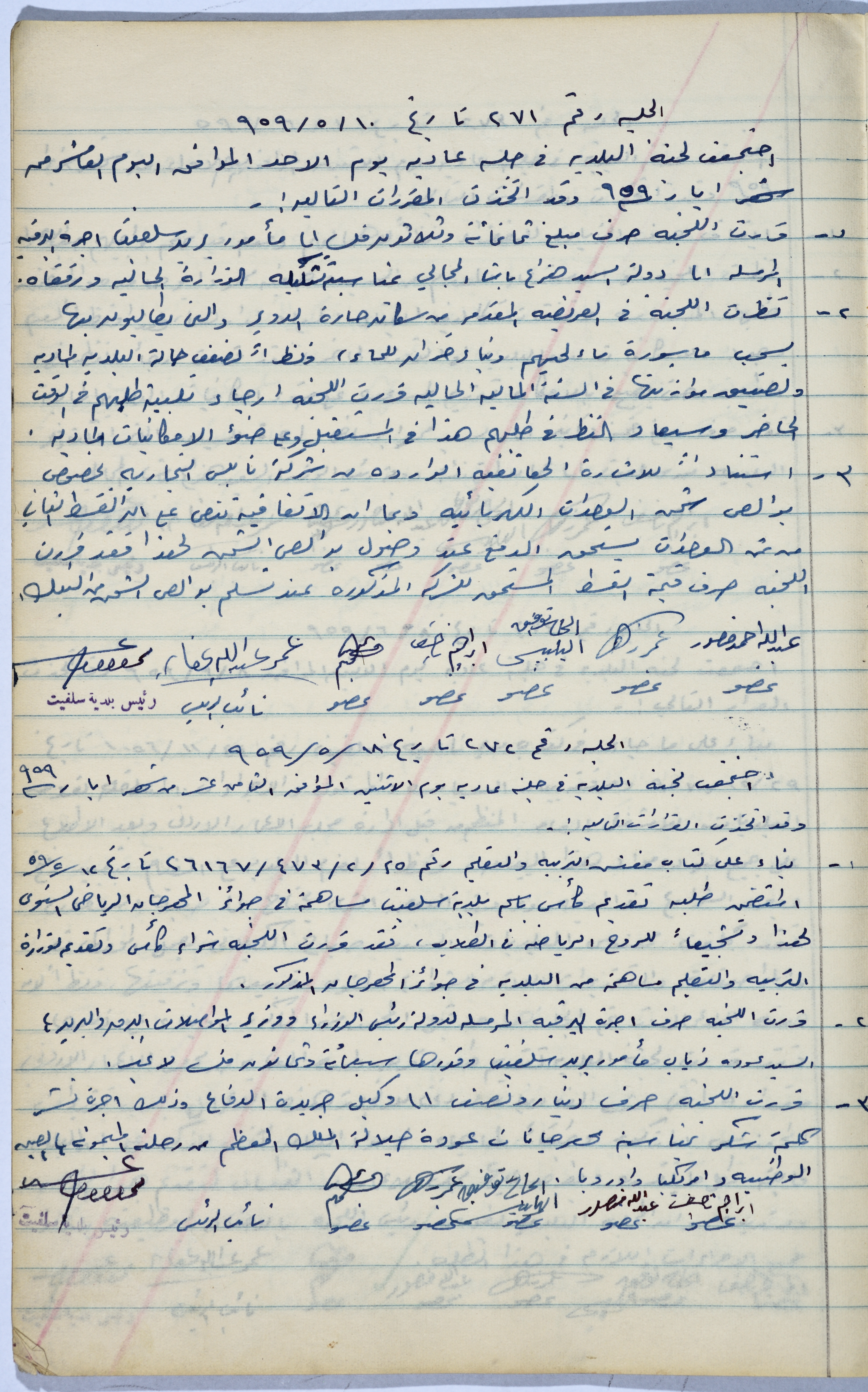 Handwritten on 10 and 18 May 1959, this document shows the minutes of sessions No. 271 and 272, convened by the Salfit Municipal Committee on these dates. During these sessions, the Committee made several decisions, including rejecting the application submitted by the residents of the ad-Dour neighbourhood for the construction of a water cistern and the extension of water pipelines to the neighbourhood, purchasing and presenting a decorative goblet to the Ministry of Education as a contribution from the Municipality in the sports festival, and disbursing the sum of one and a half dinars to the agent of ad-Difaa Newspaper for publishing a statement expressing gratitude on the occasion of the return of Hussein bil Talal, King of Jordan, from overseas.