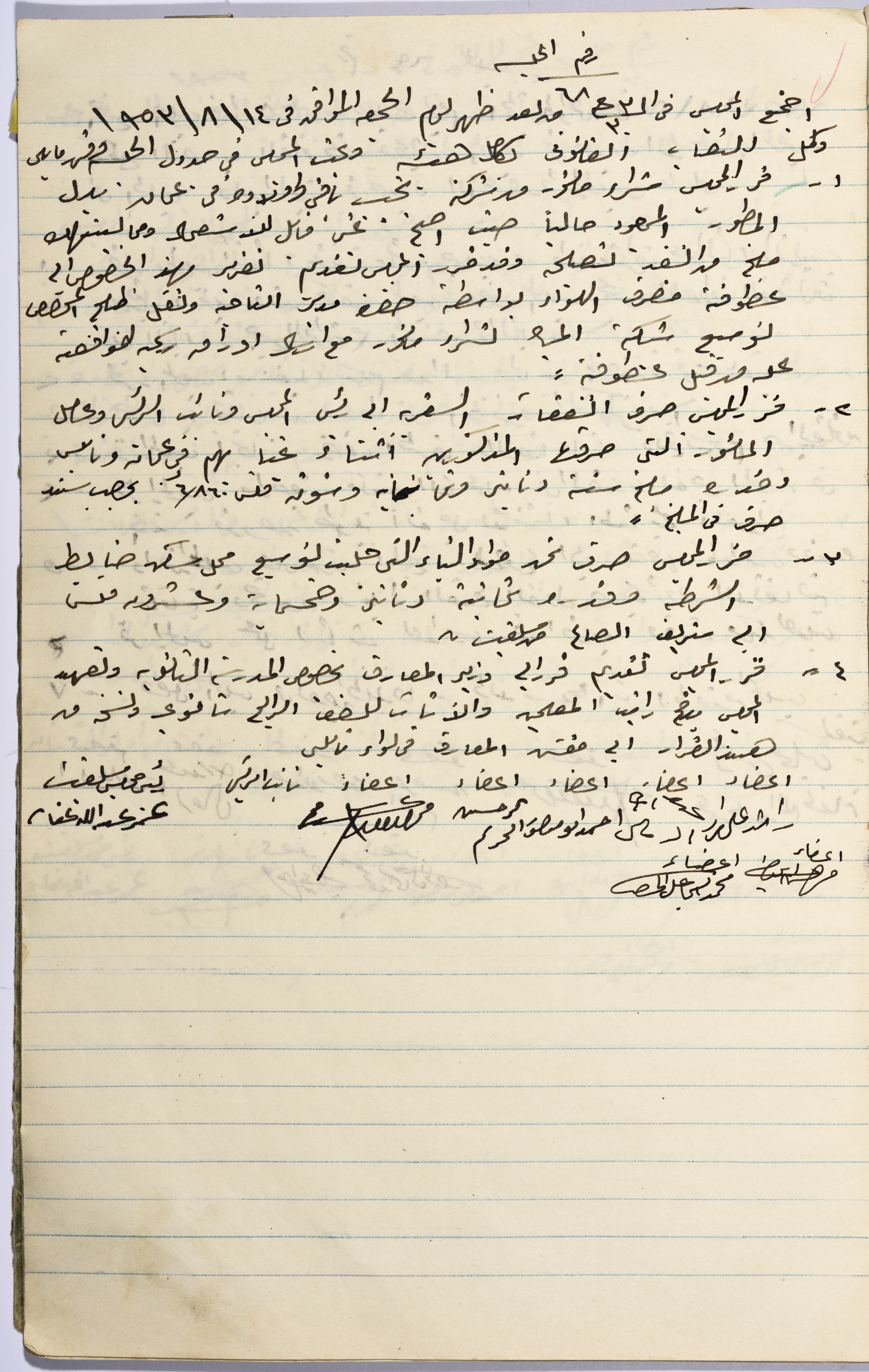 Handwritten on 14 August 1953, this document shows the minutes of session No. 68, convened by the Salfit Municipal Council on this date. During the session, the Council made several decisions, including paying the price of the construction materials intended to expand the police officer's residence and submitting a pledge to the Education Minister concerning paying the teachers' salaries and covering the costs of the furniture of the fourth-grade secondary class at the village school.