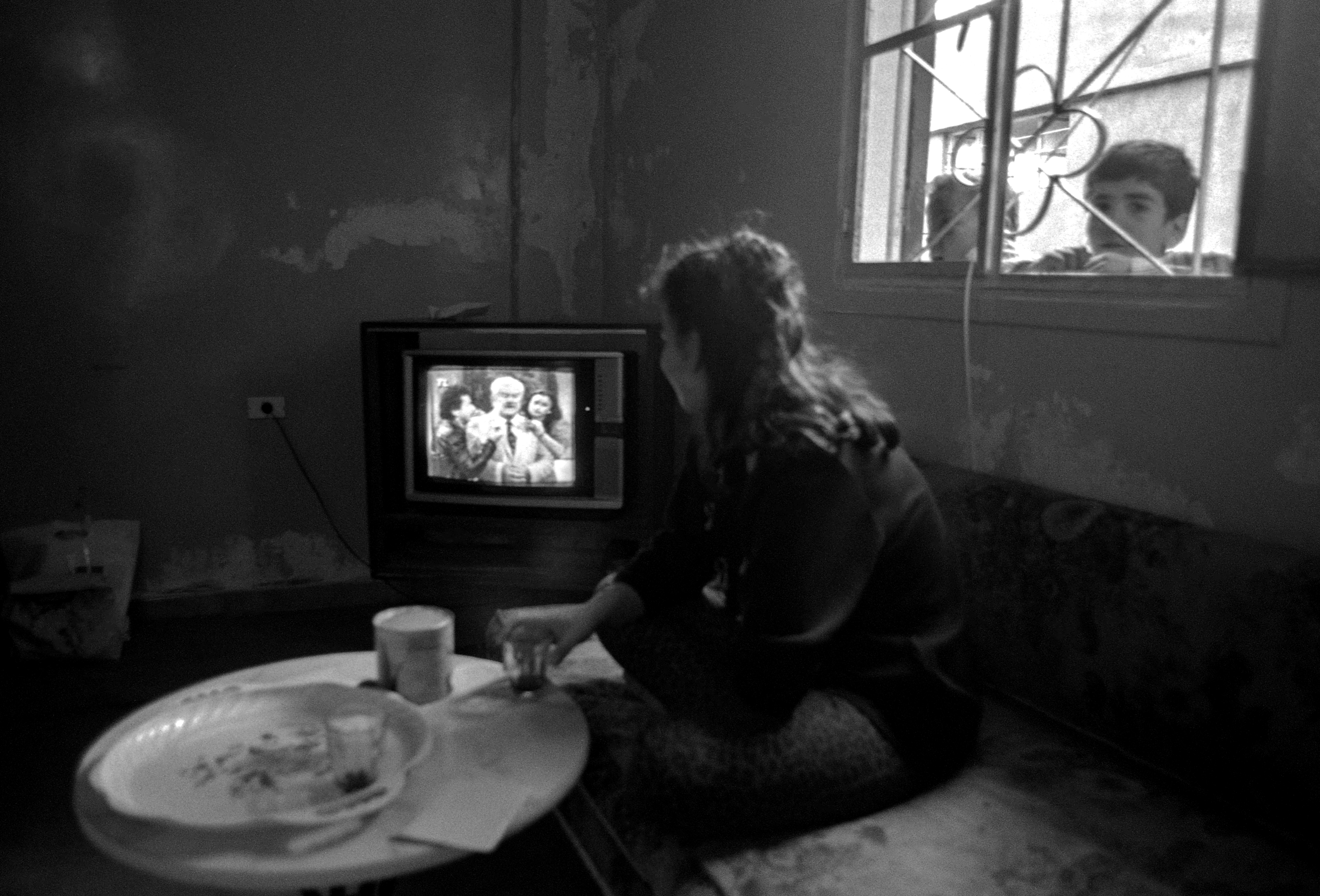 صورة التقطتها جوس دراي في نيسان 1993، لفتاة تشاهد التلفاز بينما ينظر ولدين من خلف النافذة إلى الداخل في مخيم شاتيلا للاجئين الفلسطينيين في بيروت.