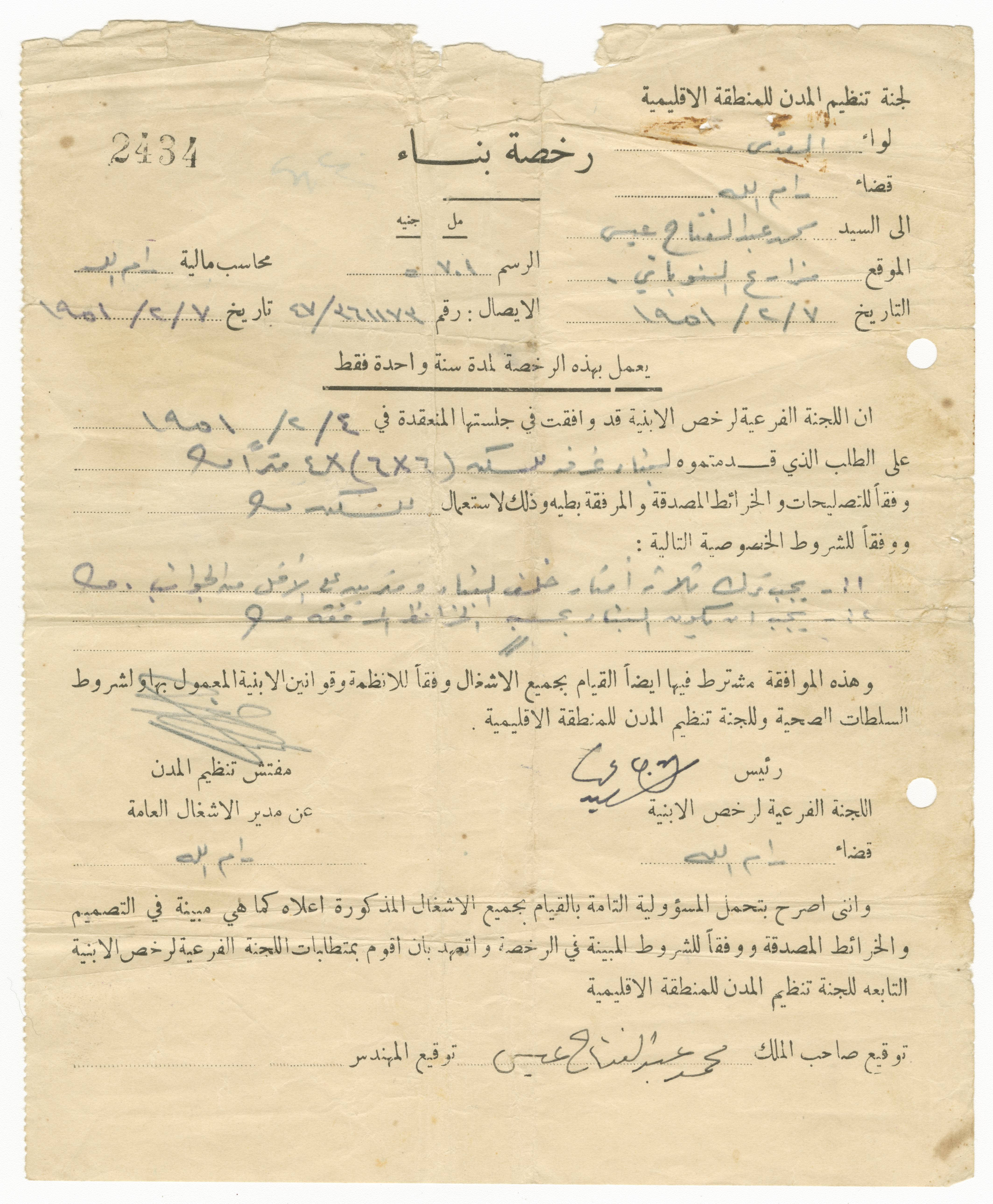 A-One paper-based document containing a construction permit belonging for Mohammed Abd al-Fatah Issa, issued by the subsidiary committee of the Constarctions Permits, Ramallah district, Dated 7/2/1951.