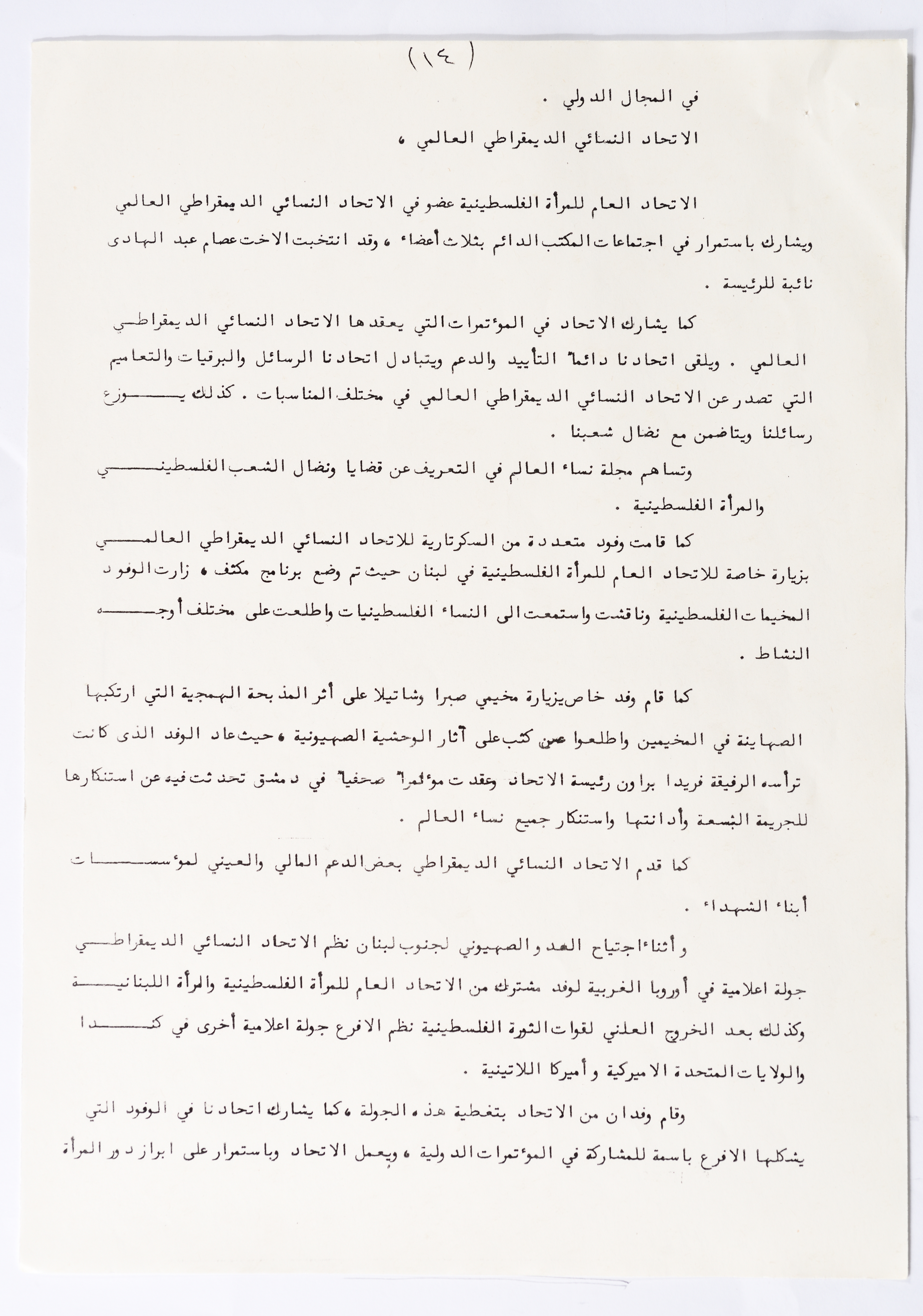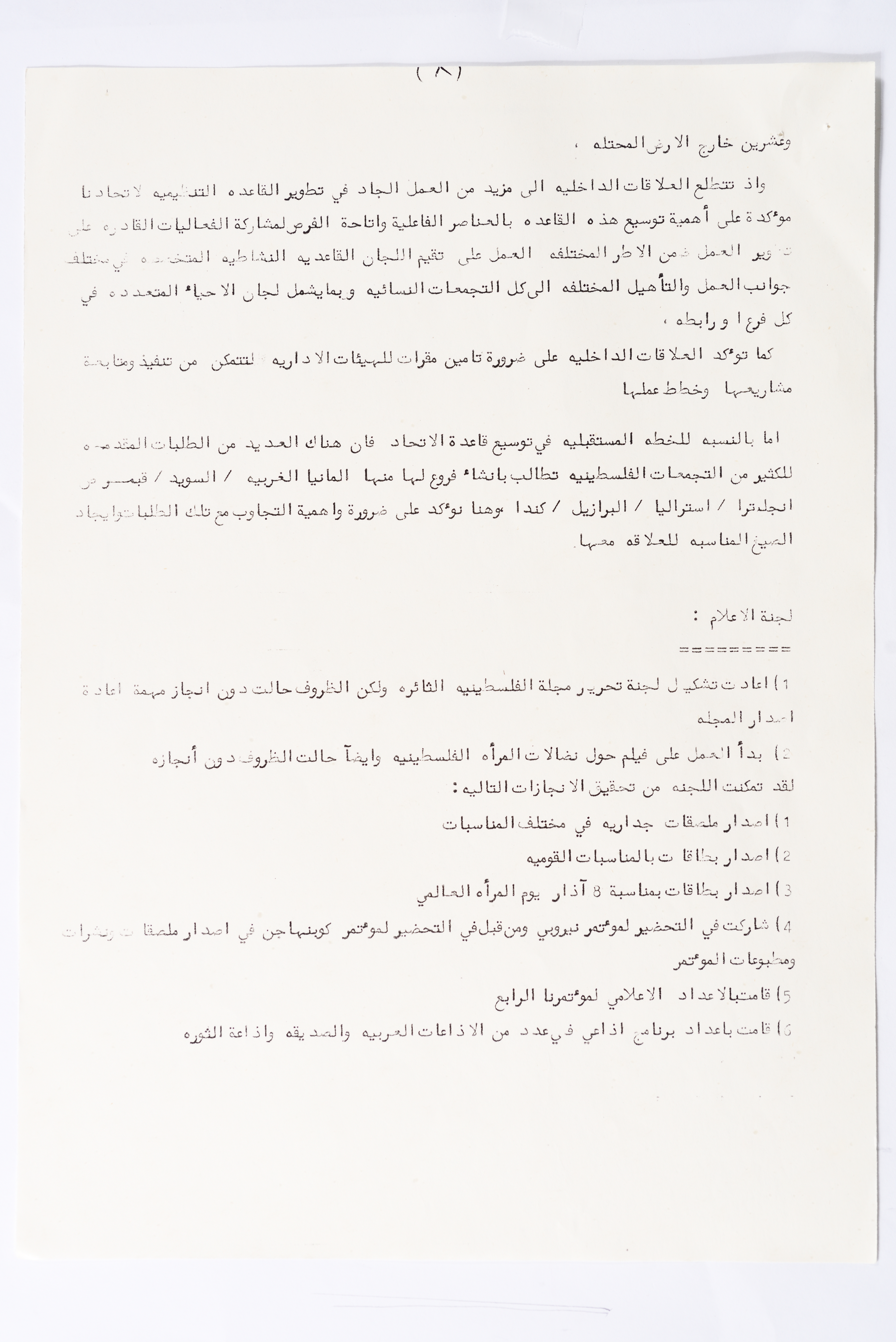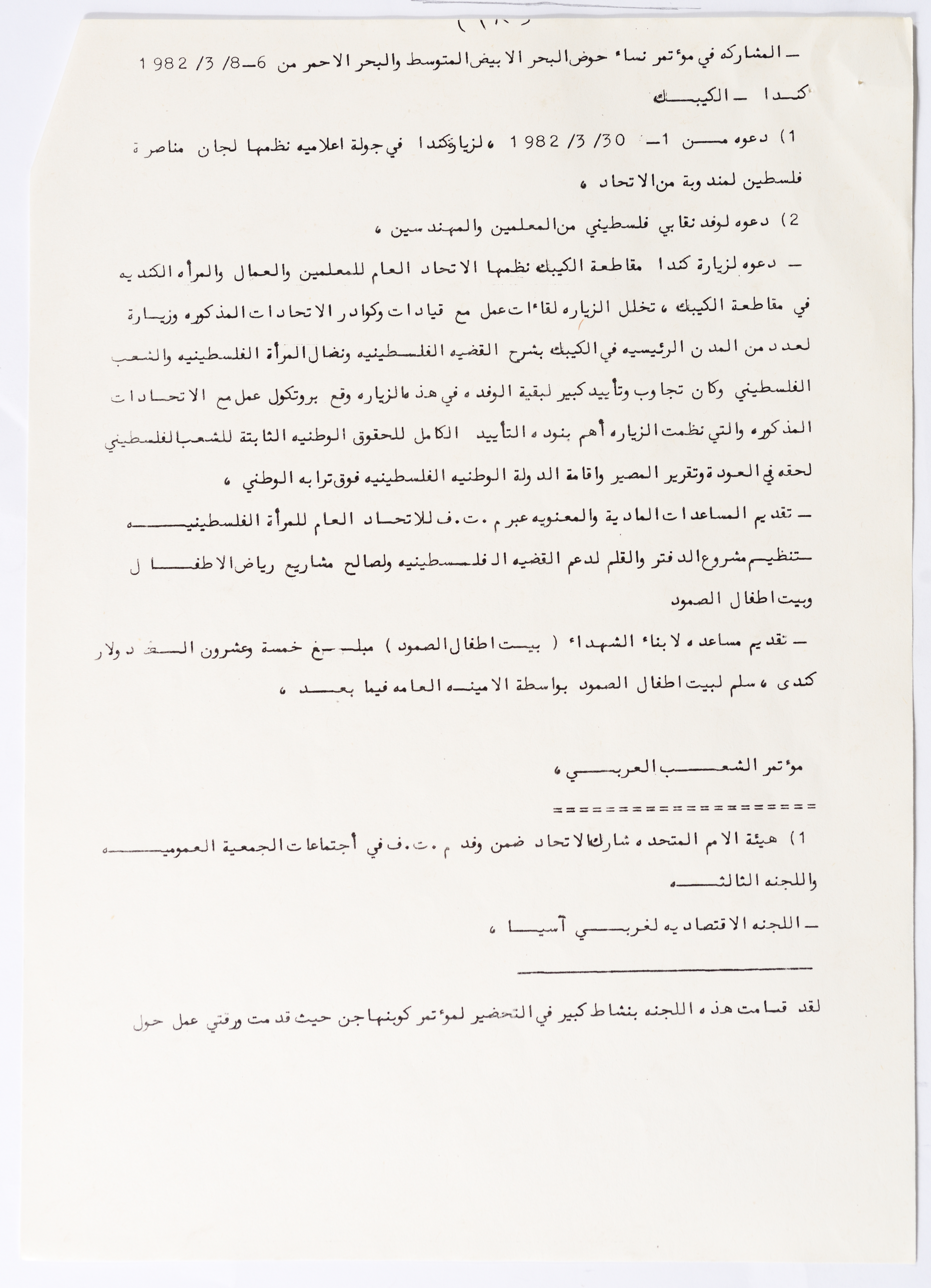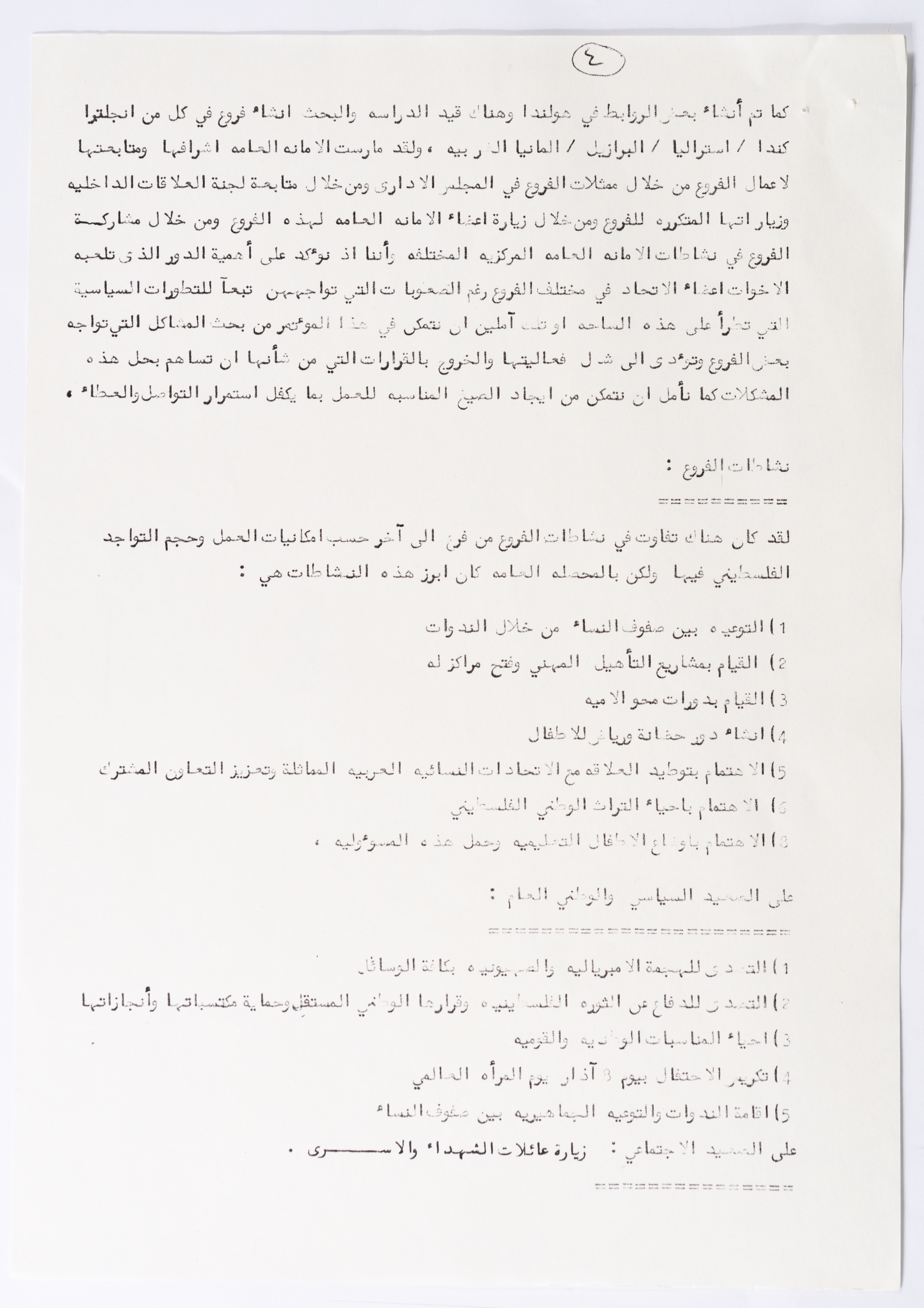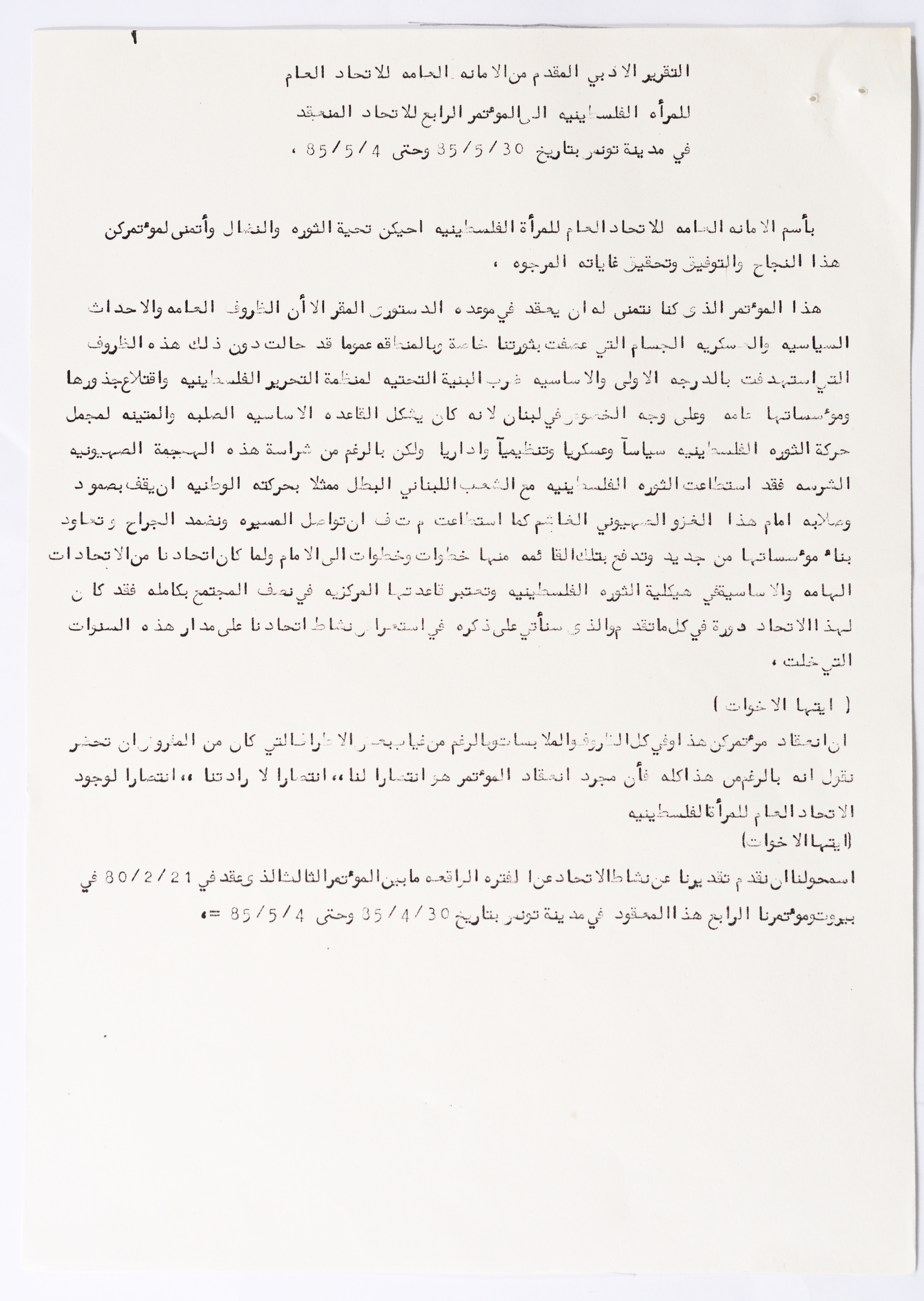 In this document, we find the literary report submitted by the General Secretariat of the General Union of Palestinian Women to the fourth conference of the Union held in Tunis, which dealt with a detailed review of the activities and activities of the General Federation of Palestinian Women. He explained why the General Conference was not held in time and in a delay due to political and military conditions and attempts to strike. The report also praised the Palestinian revolution and the Lebanese people and praised its steadfastness. The report began by talking about the administrative council, its work and its follow-up to the political events and data releases to follow up and search for solutions to problems, overcoming obstacles and crises and preparing for the general conference. It also presented the work of the Secretariat and its adoption of internal regulations and commitment to periodic meetings and the creation of new branches of the Union and supervision. The report began by talking about the administrative council, its work and its follow-up to the political events and data releases to follow up and search for solutions to problems, overcoming obstacles and crises and preparing for the general conference. It also presented the work of the Secretariat and its adoption of internal regulations and commitment to periodic meetings and the creation of new branches of the Union and supervision. As well as the activities of the branches of the Union individually, such as raising women's awareness and rehabilitation projects for women, literacy courses, establishing nurseries and working on reviving the Palestinian heritage, reviving national events, defending the revolution, celebrating March 8, holding seminars and visiting families of shaheeds. The report explained the work of the central committees and the nature of their work: Committee on Foreign Relations: and prepared for conferences and the work of the report and the establishment of courses. And the Committee on Internal Relations: Talk about the study of the situation of the branches and solve problems and the establishment of new branches of the Union. In addition to the Committee on Information: It has re-formed the editorial board of the Palestinian magazine Al-Thaerah and issued posters and cards at national events and preparing for conferences. Cultural Committee: Worked to prepare seminars and collect books on Palestinian women and the work of education sessions. Social Committee: Its work focuses on three aspects: 1- Health 2- Kindergartens 3- Women and vocational rehabilitation. The report also mentioned the Federation's relationship with the PLO and noted that the Union was able to increase the share of women in the National Assembly from 21 to 23. In addition to the presence of three representatives in the Central Council and their representative in the Supreme Council for Education, Culture and Science. And 3 delegates in the Supreme Council for Literacy, and contribute to the development of plans for the Central Council of Kindergartens. And to participate in the membership of the Committee on the affairs of the occupied homeland and follow-up issues and the Committee for the Defense of Prisoners and Detainees and committees of friendship with peoples and international organizations. The report also mentioned the conferences and visits of the General Federation.